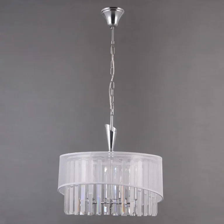 Преобладающий цвет люстры: Белый, плафонов: Белый, арматуры: Хром; материал изготовления арматуры: Металл, размеры, мм: / высота 320 / диаметр 640. Общая мощность – 300 Ватт, а максимальная площадь освещения до 15 м2. Основной тип ламп, предусмотренный производителем: Накаливания с цоколем E14. В зависимости от предпочтений можно использовать лампы теплового, холодного или нейтрального света, за исключением люстр с типом цоколя LED.