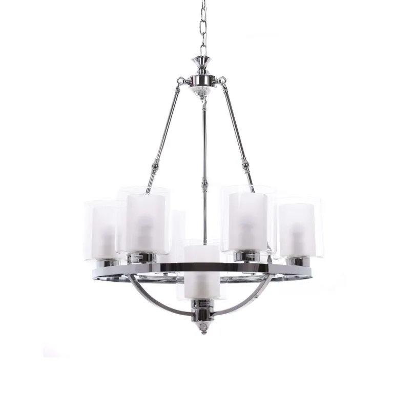 Люстра выполнена в изысканном хромированном корпусе с белыми матовыми плафонами, что придаёт ей современный и стильный вид. Она совместима с лампами типа E14 и может вмещать до 7 источников света, обеспечивая яркое и равномерное освещение пространства площадью до 30 квадратных метров.