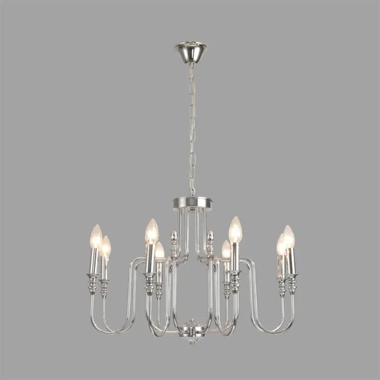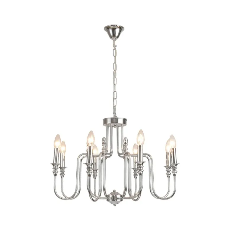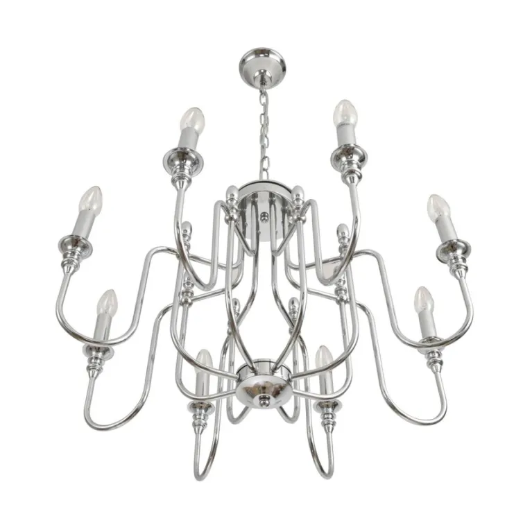 Преобладающий цвет арматуры: Хром; материал изготовления арматуры: Металл, размеры, мм: / высота 960 / диаметр 640. Общая мощность – 320 Ватт. Основной тип ламп, предусмотренный производителем: Накаливания с цоколем E14. В зависимости от предпочтений можно использовать лампы теплового, холодного или нейтрального света, за исключением люстр с типом цоколя LED.
