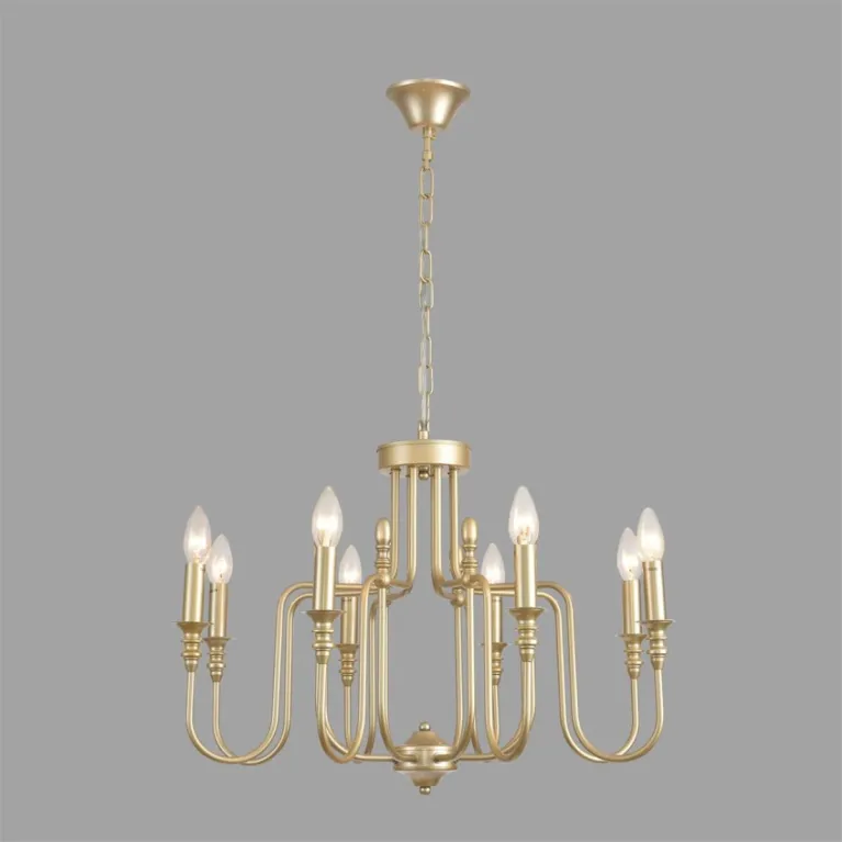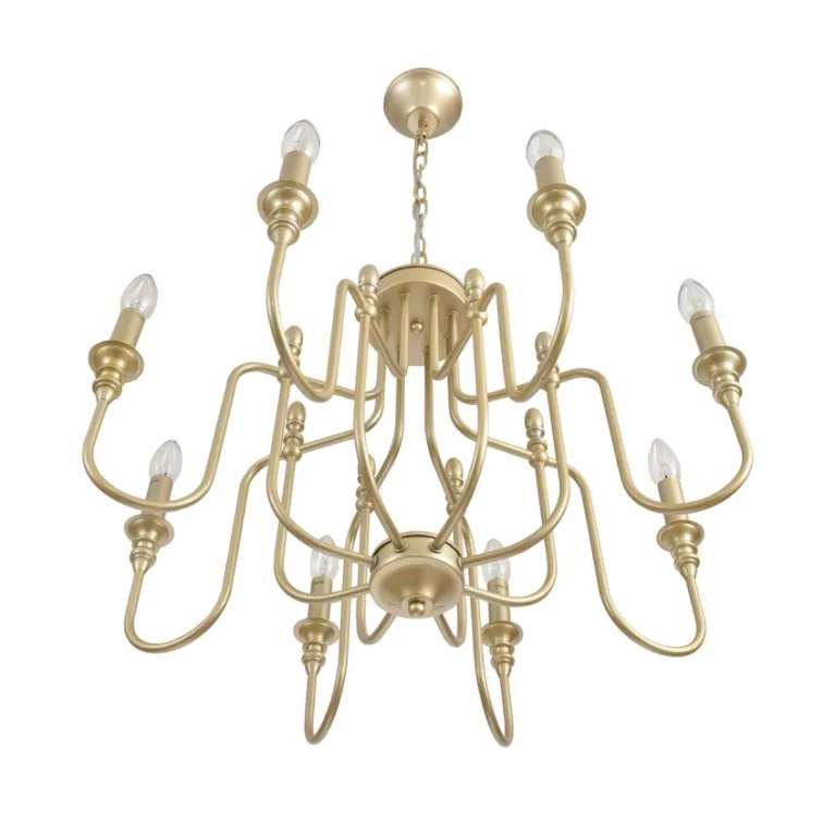 Преобладающий цвет арматуры: Золото; материал изготовления арматуры: Металл, размеры, мм: / высота 960 / диаметр 640. Общая мощность – 320 Ватт. Основной тип ламп, предусмотренный производителем: Накаливания с цоколем E14. В зависимости от предпочтений можно использовать лампы теплового, холодного или нейтрального света, за исключением люстр с типом цоколя LED.