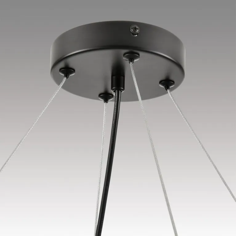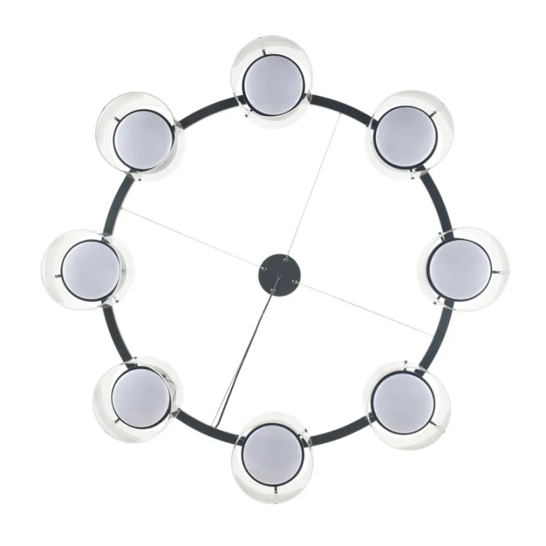 Преобладающий цвет плафонов: Прозрачный, арматуры: Черный; материал изготовления арматуры: Металл, размеры, мм: / высота 620 / диаметр 850. Общая мощность – 80 Ватт, а максимальная площадь освещения до 16 м2. Основной тип ламп, предусмотренный производителем: Светодиодная с цоколем GX70. В зависимости от предпочтений можно использовать лампы теплового, холодного или нейтрального света, за исключением люстр с типом цоколя LED.