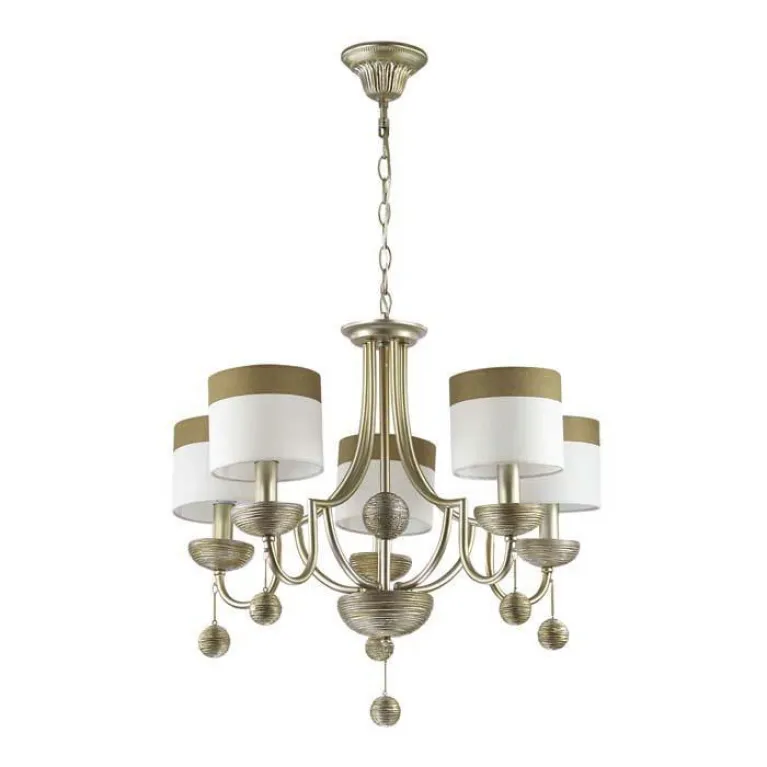 Преобладающий цвет люстры: Золотой, плафонов: Белый, арматуры: Золото; материал изготовления арматуры: Металл, размеры, мм: / высота 980 / диаметр 640. Общая мощность – 200 Ватт, а максимальная площадь освещения до 11,1 м2. Основной тип ламп, предусмотренный производителем: Накаливания с цоколем E14. В зависимости от предпочтений можно использовать лампы теплового, холодного или нейтрального света, за исключением люстр с типом цоколя LED.