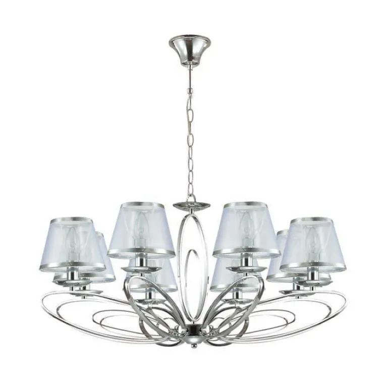 Преобладающий цвет люстры: Белый, плафонов: Белый, арматуры: Хром; материал изготовления арматуры: Металл, размеры, мм: / высота 790 / диаметр 780. Общая мощность – 320 Ватт, а максимальная площадь освещения до 17,8 м2. Основной тип ламп, предусмотренный производителем: Накаливания с цоколем E14. В зависимости от предпочтений можно использовать лампы теплового, холодного или нейтрального света, за исключением люстр с типом цоколя LED.