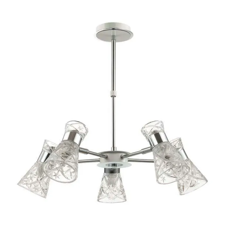 Преобладающий цвет люстры: Белый, плафонов: Прозрачный, арматуры: Хром; материал изготовления арматуры: Металл, размеры, мм: / высота 430 / диаметр 590. Общая мощность – 300 Ватт, а максимальная площадь освещения до 16,7 м2. Основной тип ламп, предусмотренный производителем: Накаливания с цоколем E14. В зависимости от предпочтений можно использовать лампы теплового, холодного или нейтрального света, за исключением люстр с типом цоколя LED.