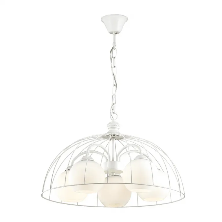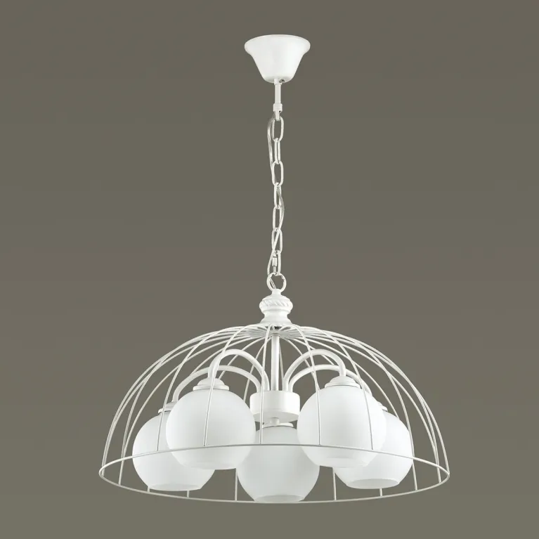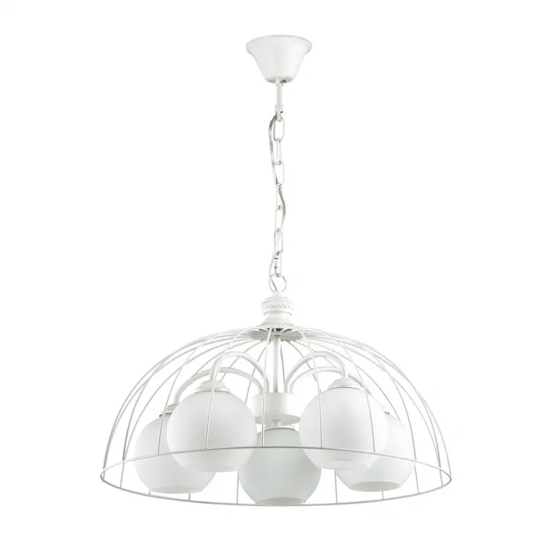 Преобладающий цвет люстры: Белый, плафонов: Белый, арматуры: Белый; материал изготовления арматуры: Металл, размеры, мм: / высота 710 / диаметр 550. Общая мощность – 300 Ватт. Основной тип ламп, предусмотренный производителем: Накаливания с цоколем E27. В зависимости от предпочтений можно использовать лампы теплового, холодного или нейтрального света, за исключением люстр с типом цоколя LED.