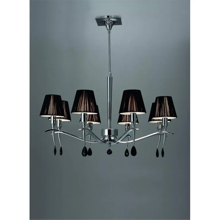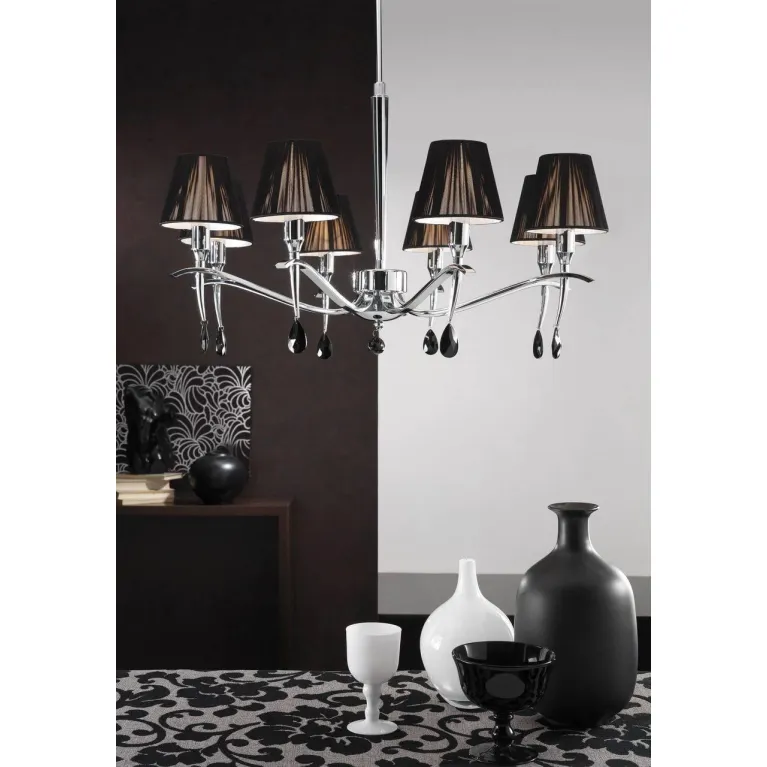 Преобладающий цвет люстры: Черный, плафонов: Черный, арматуры: Хром; материал изготовления арматуры: Металл, размеры, мм: / высота 780 / диаметр 750. Общая мощность – 480 Ватт, а максимальная площадь освещения до 26,7 м2. Основной тип ламп, предусмотренный производителем: Накаливания с цоколем E14. В зависимости от предпочтений можно использовать лампы теплового, холодного или нейтрального света, за исключением люстр с типом цоколя LED.