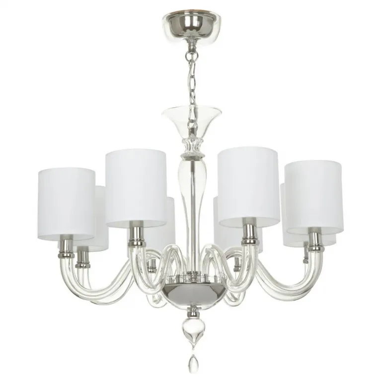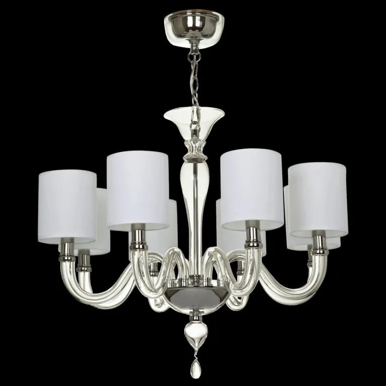 Преобладающий цвет люстры: Белый, плафонов: Белый, арматуры: Хром; материал изготовления арматуры: Металл, размеры, мм: / высота 620 / диаметр 760. Общая мощность – 320 Ватт. Основной тип ламп, предусмотренный производителем: Накаливания с цоколем E14. В зависимости от предпочтений можно использовать лампы теплового, холодного или нейтрального света, за исключением люстр с типом цоколя LED.