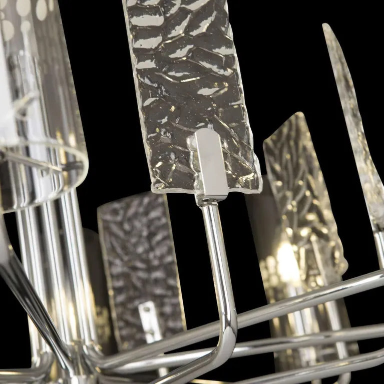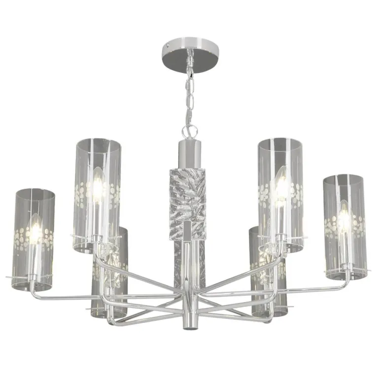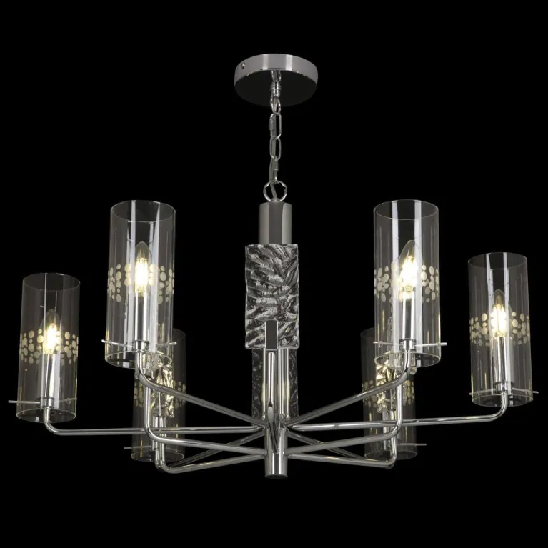 Преобладающий цвет люстры: Хром, плафонов: Прозрачный, арматуры: Хром; материал изготовления арматуры: Металл, размеры, мм: / высота 425 / диаметр 690. Общая мощность – 240 Ватт. Основной тип ламп, предусмотренный производителем: Накаливания с цоколем E14. В зависимости от предпочтений можно использовать лампы теплового, холодного или нейтрального света, за исключением люстр с типом цоколя LED.
