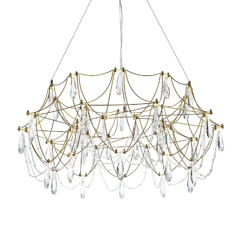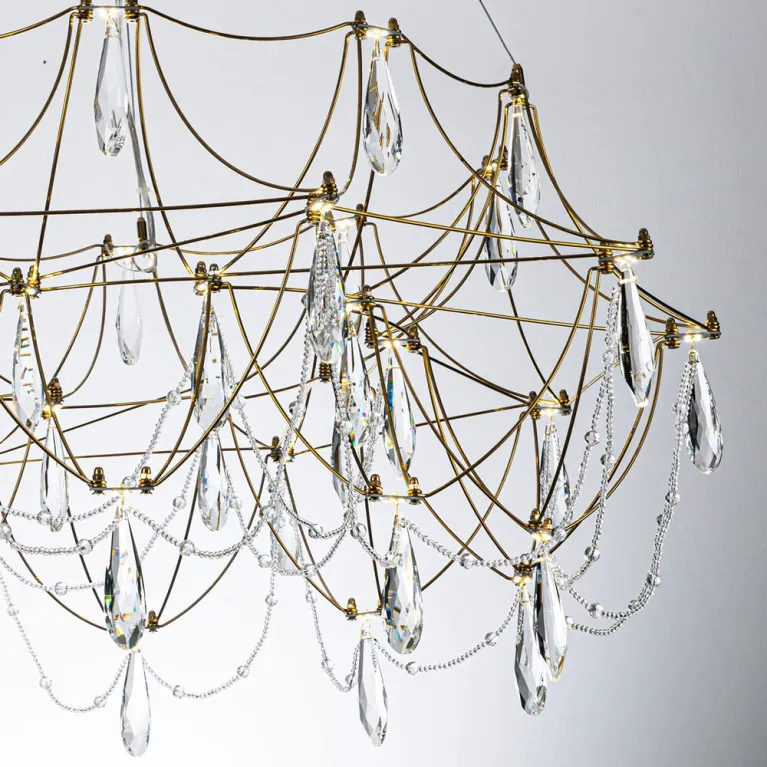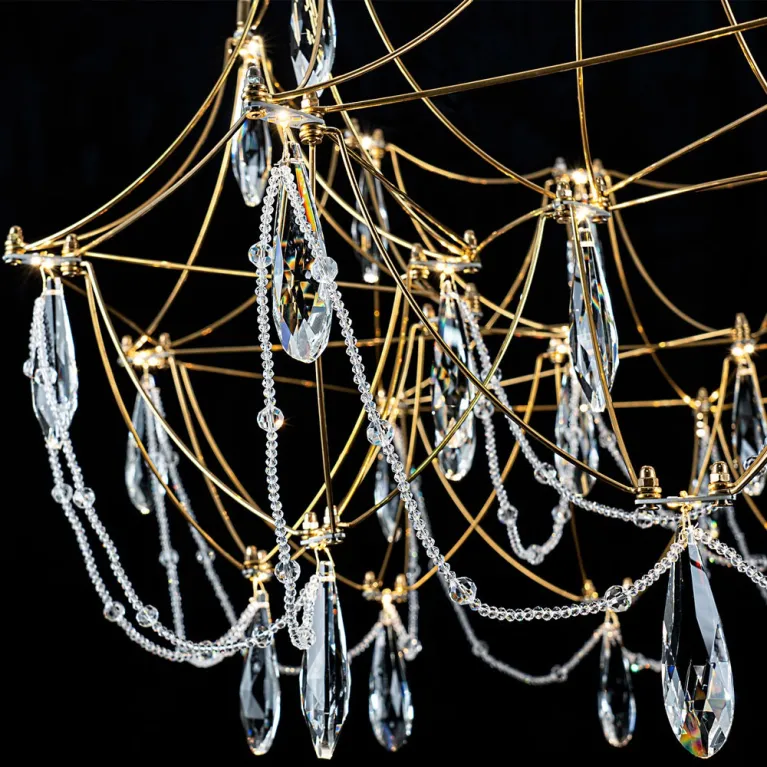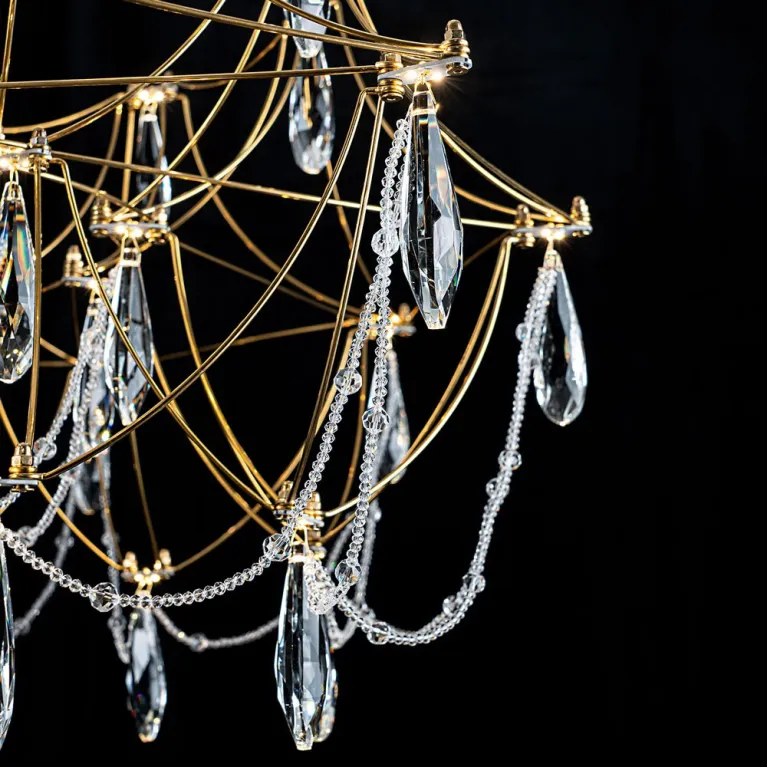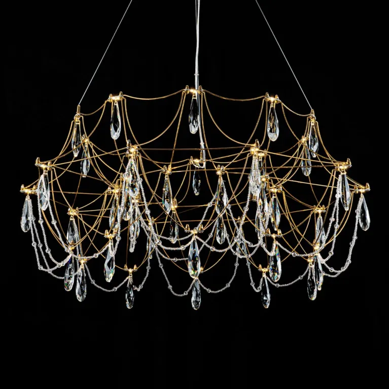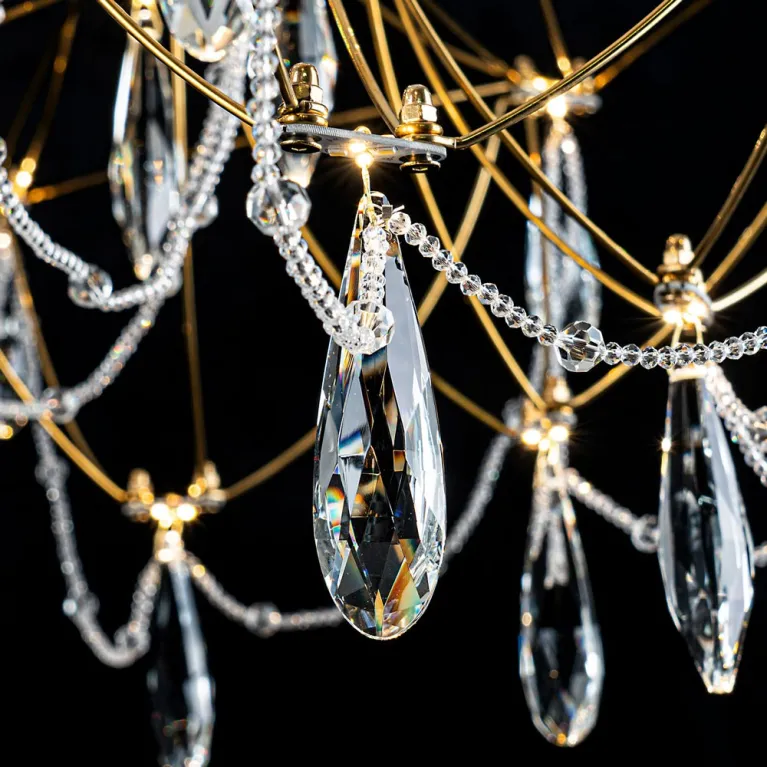 Преобладающий цвет плафонов: Прозрачный, арматуры: Латунь; материал изготовления арматуры: Металл, размеры, мм: / высота 2000 / диаметр 800. Общая мощность – 40 Ватт. Основной тип ламп, предусмотренный производителем: Светодиодная с цоколем LED. В зависимости от предпочтений можно использовать лампы теплового, холодного или нейтрального света, за исключением люстр с типом цоколя LED.