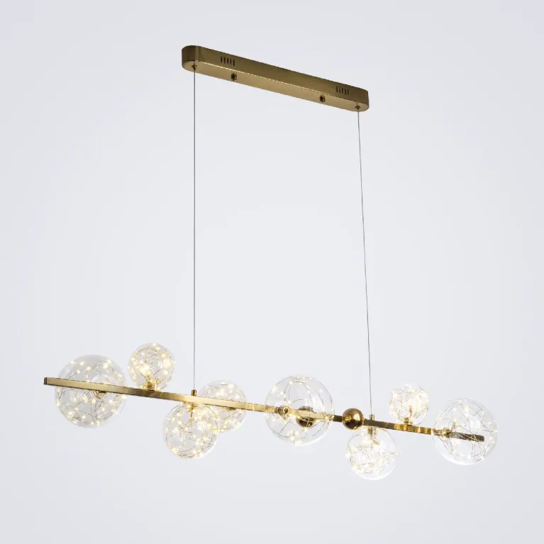 Преобладающий цвет плафонов: Прозрачный, арматуры: Латунь; материал изготовления арматуры: Металл, размеры, мм: длина 1100 / ширина 300 / высота 1100 Общая мощность – 40 Ватт. Основной тип ламп, предусмотренный производителем: Светодиодная с цоколем LED. В зависимости от предпочтений можно использовать лампы теплового, холодного или нейтрального света, за исключением люстр с типом цоколя LED.