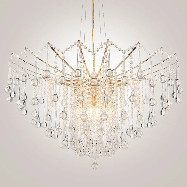 Преобладающий цвет плафонов: Прозрачный, арматуры: Золото; материал изготовления арматуры: Металл, размеры, мм: / высота 1300 / диаметр 850. Общая мощность – 400 Ватт. Основной тип ламп, предусмотренный производителем: Накаливания с цоколем E14. В зависимости от предпочтений можно использовать лампы теплового, холодного или нейтрального света, за исключением люстр с типом цоколя LED.