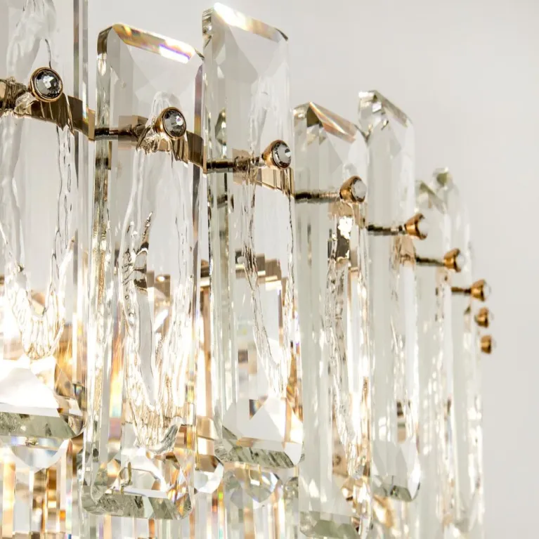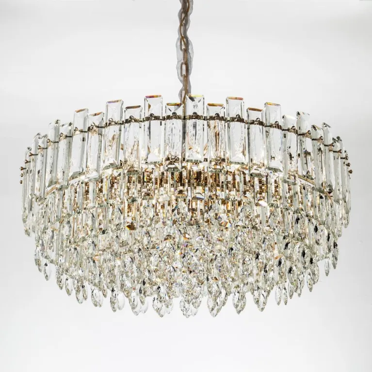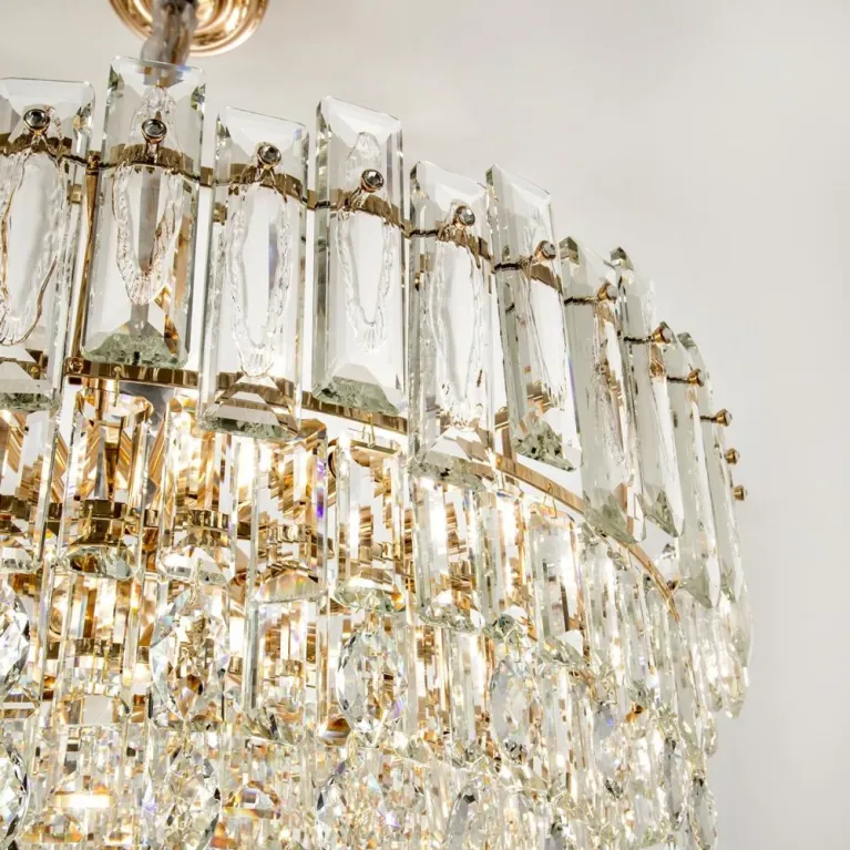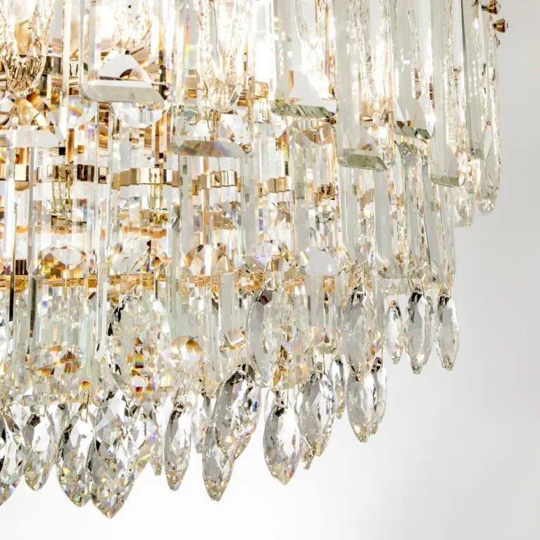 Преобладающий цвет плафонов: Прозрачный, арматуры: Золото; материал изготовления арматуры: Металл, размеры, мм: / высота 1000 / диаметр 800. Общая мощность – 720 Ватт, а максимальная площадь освещения до 22 м2. Основной тип ламп, предусмотренный производителем: Накаливания с цоколем E14. В зависимости от предпочтений можно использовать лампы теплового, холодного или нейтрального света, за исключением люстр с типом цоколя LED.