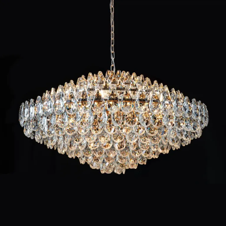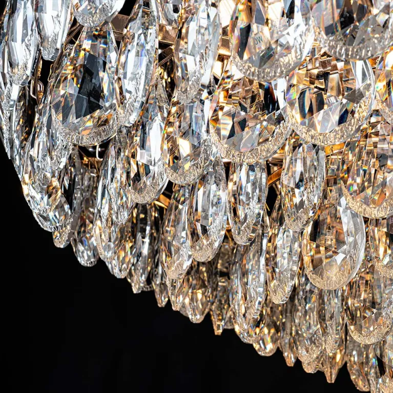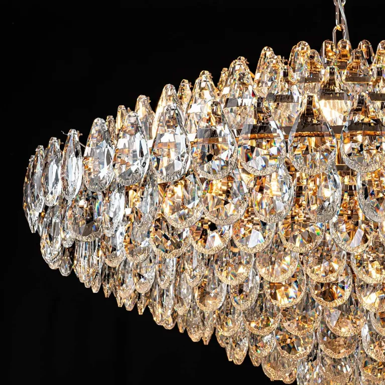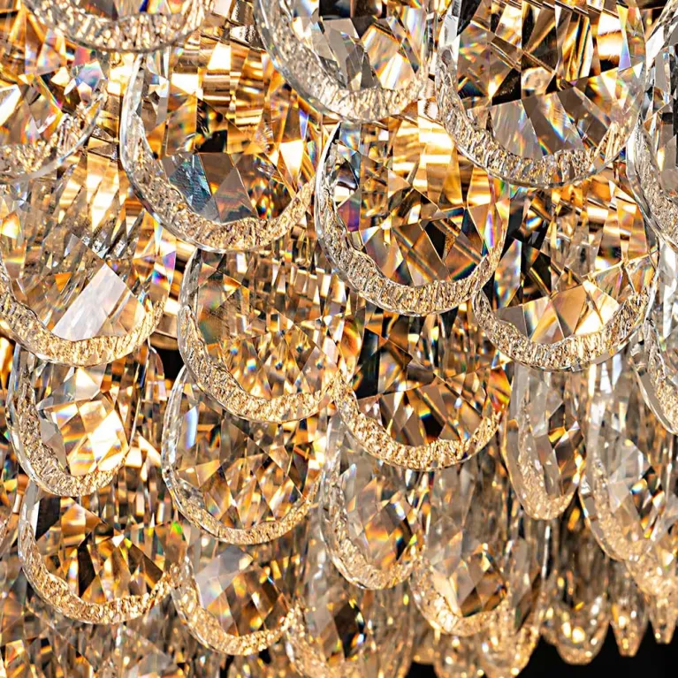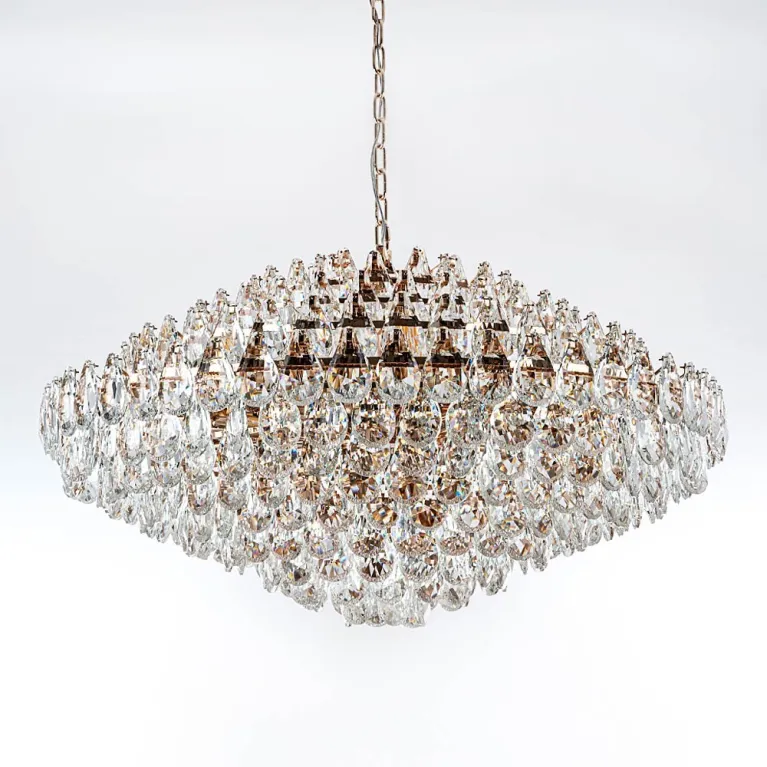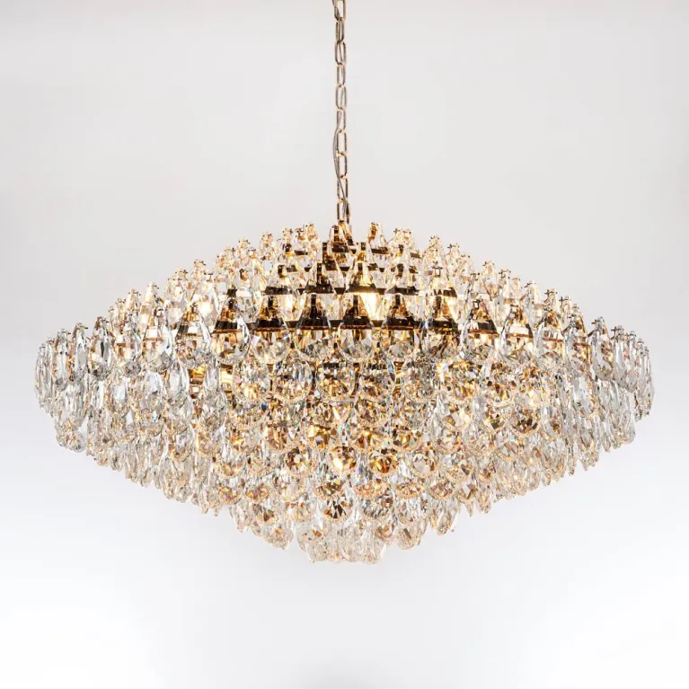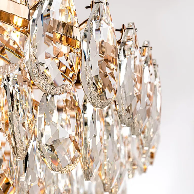 Преобладающий цвет плафонов: Прозрачный, арматуры: Золото; материал изготовления арматуры: Металл, размеры, мм: / высота 1320 / диаметр 950. Общая мощность – 1280 Ватт. Основной тип ламп, предусмотренный производителем: Накаливания с цоколем E14. В зависимости от предпочтений можно использовать лампы теплового, холодного или нейтрального света, за исключением люстр с типом цоколя LED.