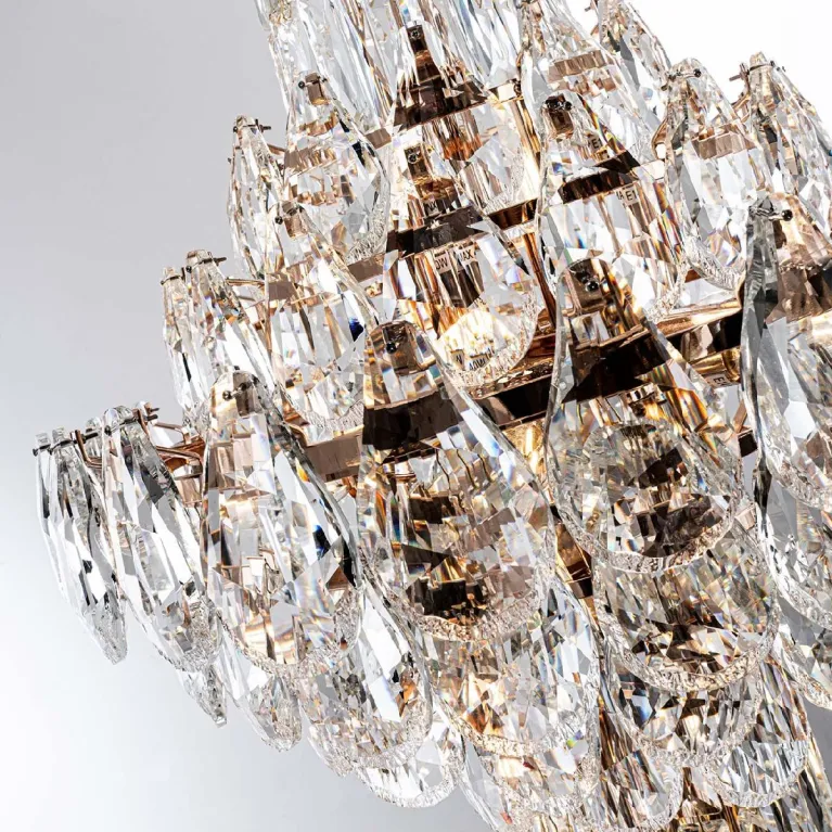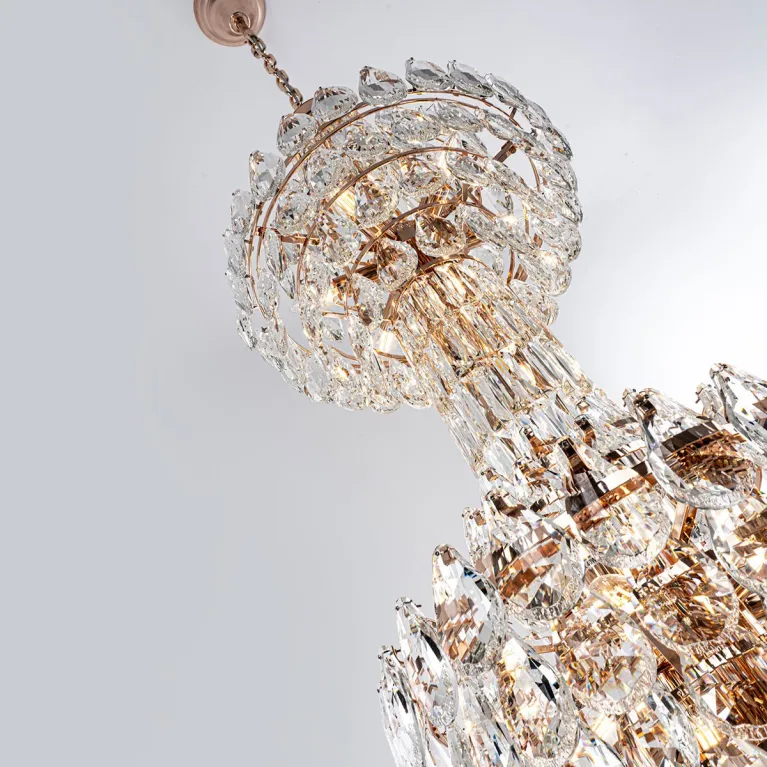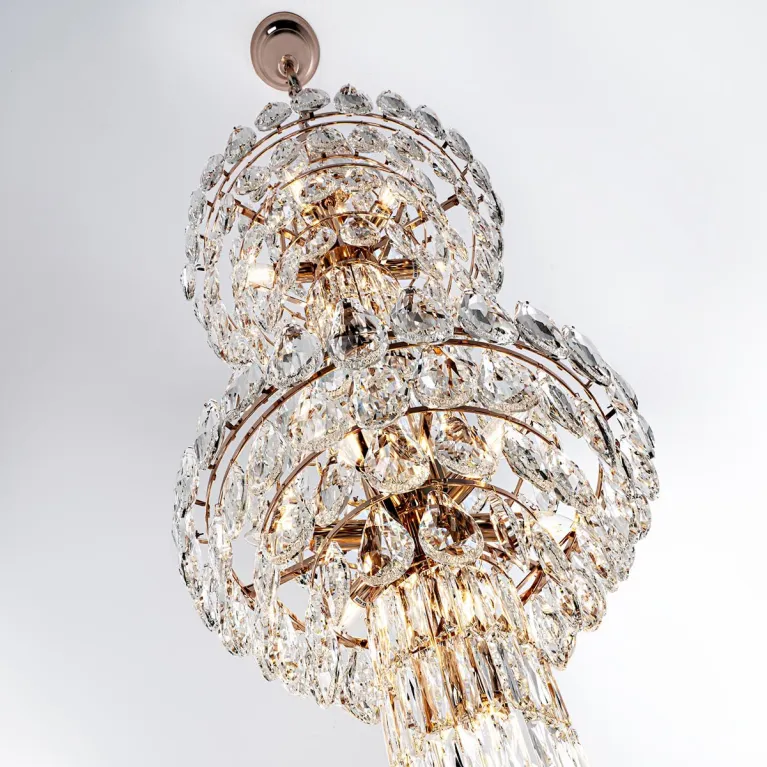 Преобладающий цвет плафонов: Прозрачный, арматуры: Золото; материал изготовления арматуры: Металл, размеры, мм: / высота 2900 / диаметр 550. Общая мощность – 1560 Ватт. Основной тип ламп, предусмотренный производителем: Накаливания с цоколем E14. В зависимости от предпочтений можно использовать лампы теплового, холодного или нейтрального света, за исключением люстр с типом цоколя LED.