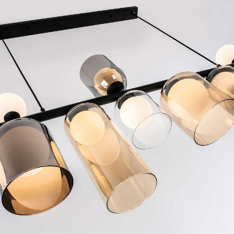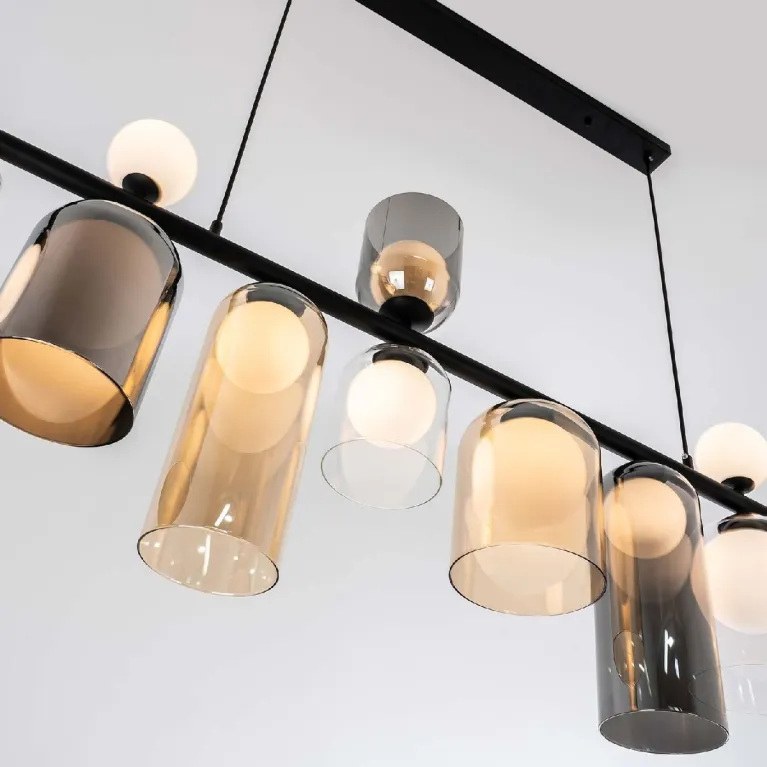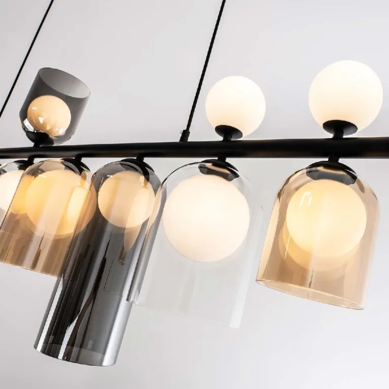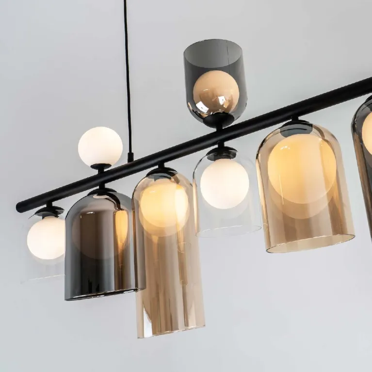Преобладающий цвет плафонов: Разноцветный, арматуры: Черный; материал изготовления арматуры: Металл, размеры, мм: длина 1340 / ширина 150 / высота 1400 Общая мощность – Ватт, а максимальная площадь освещения до 7 м2. Основной тип ламп, предусмотренный производителем: с цоколем G9. В зависимости от предпочтений можно использовать лампы теплового, холодного или нейтрального света, за исключением люстр с типом цоколя LED.
