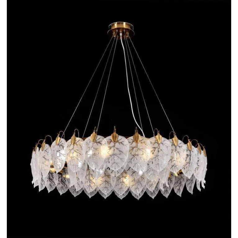 Преобладающий цвет люстры: Золотой, плафонов: Прозрачный, арматуры: Золотой; материал изготовления арматуры: Металл, размеры, мм: / диаметр 600. Общая мощность – 480 Ватт, а максимальная площадь освещения до 22 м2. Основной тип ламп, предусмотренный производителем: Накаливания с цоколем E14. В зависимости от предпочтений можно использовать лампы теплового, холодного или нейтрального света, за исключением люстр с типом цоколя LED.