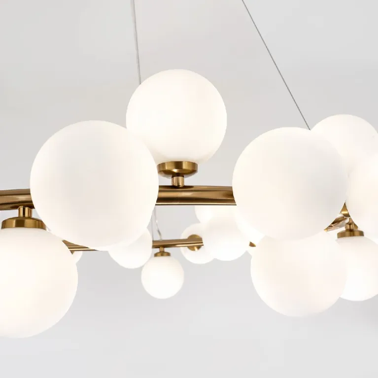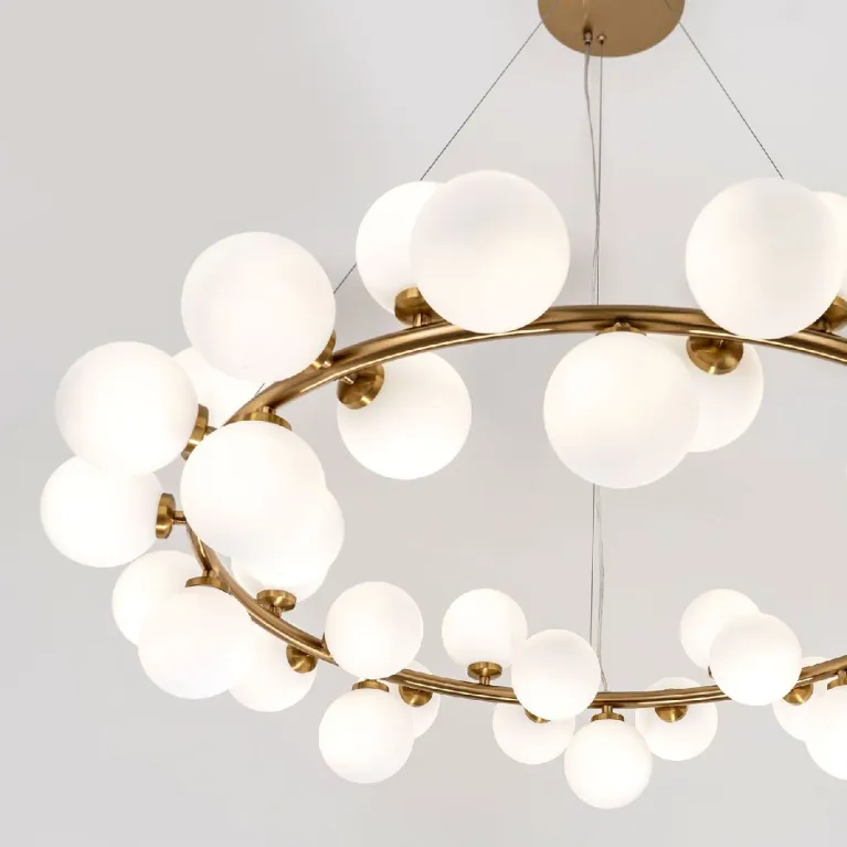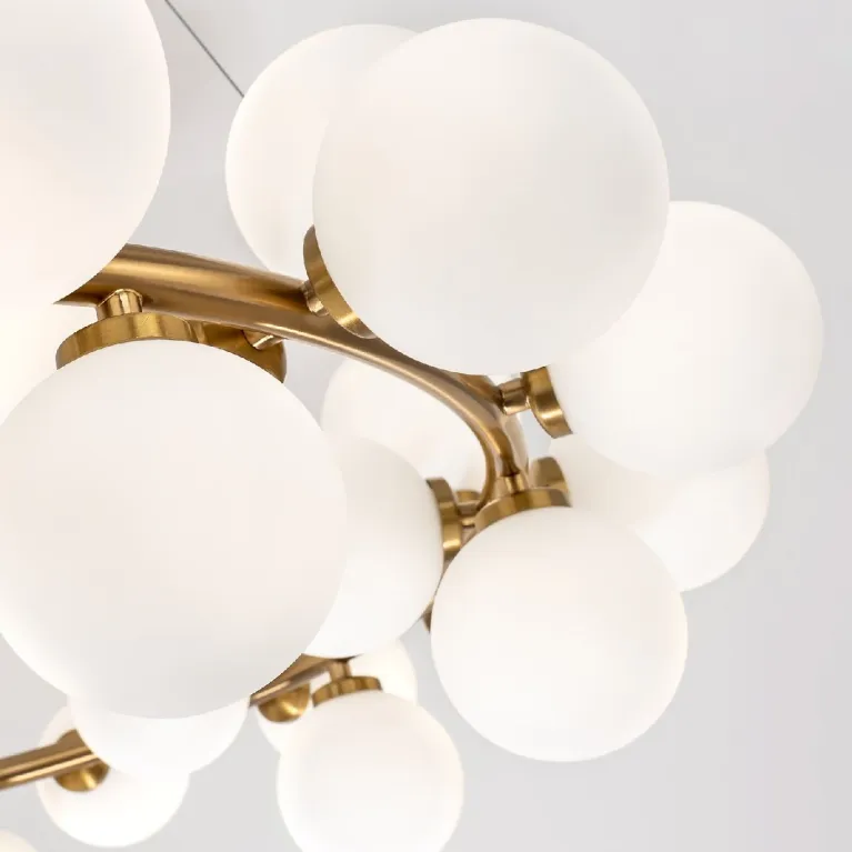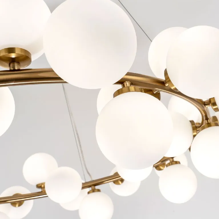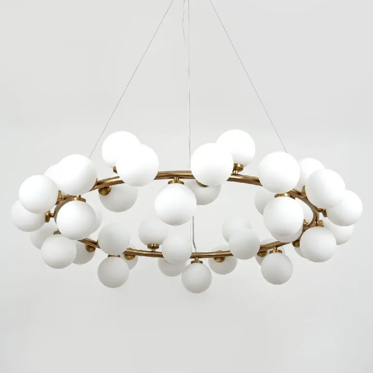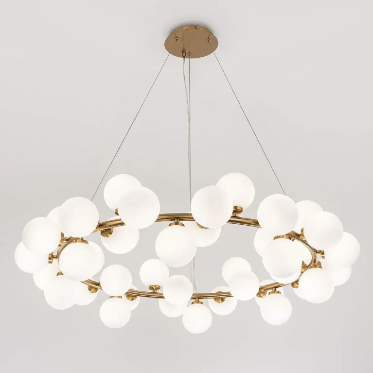 Преобладающий цвет плафонов: Белый, арматуры: Латунь; материал изготовления арматуры: Металл, размеры, мм: / высота 1500 / диаметр 1000. Общая мощность – Ватт, а максимальная площадь освещения до 30 м2. Основной тип ламп, предусмотренный производителем: с цоколем G9. В зависимости от предпочтений можно использовать лампы теплового, холодного или нейтрального света, за исключением люстр с типом цоколя LED.