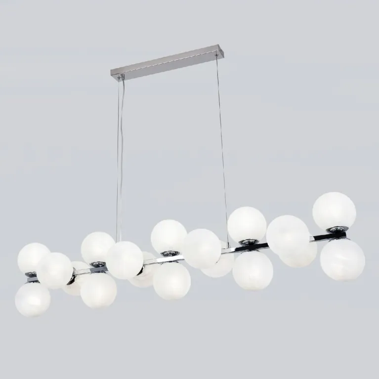 Преобладающий цвет плафонов: Белый, арматуры: Хром; материал изготовления арматуры: Металл, размеры, мм: длина 1250 / ширина 280 / высота 1200 Общая мощность – 720 Ватт, а максимальная площадь освещения до 20 м2. Основной тип ламп, предусмотренный производителем: Накаливания с цоколем E14. В зависимости от предпочтений можно использовать лампы теплового, холодного или нейтрального света, за исключением люстр с типом цоколя LED.