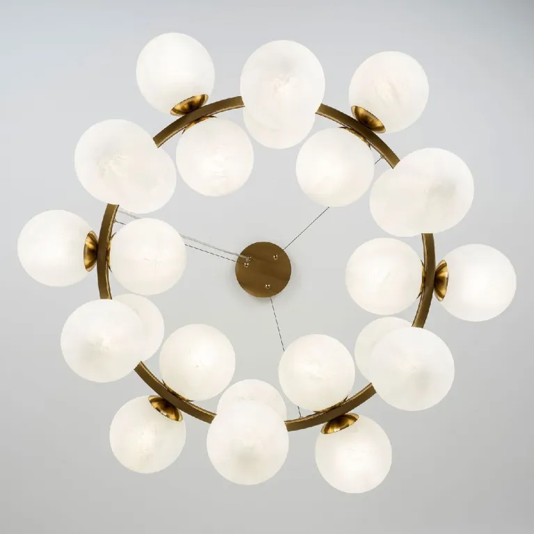Преобладающий цвет плафонов: Белый, арматуры: Латунь; материал изготовления арматуры: Металл, размеры, мм: / высота 1200 / диаметр 850. Общая мощность – 960 Ватт, а максимальная площадь освещения до 25 м2. Основной тип ламп, предусмотренный производителем: Накаливания с цоколем E14. В зависимости от предпочтений можно использовать лампы теплового, холодного или нейтрального света, за исключением люстр с типом цоколя LED.