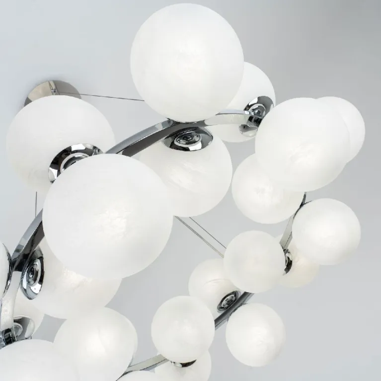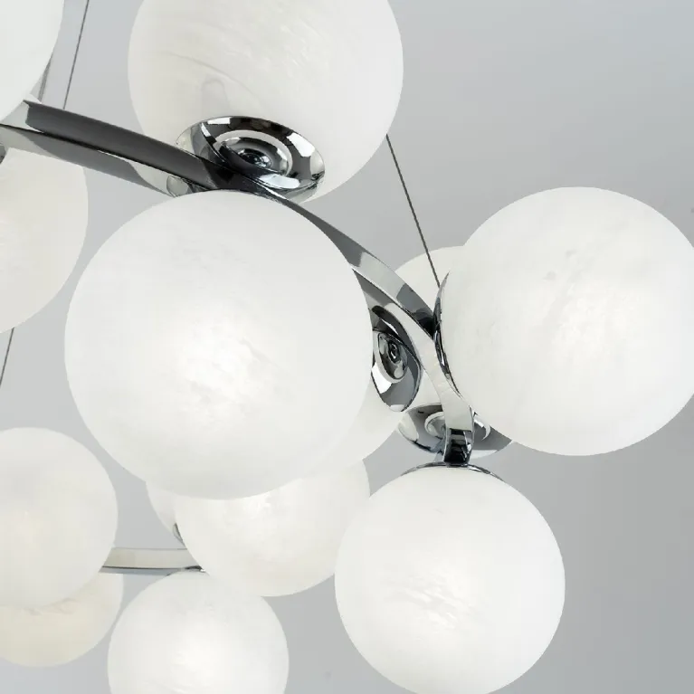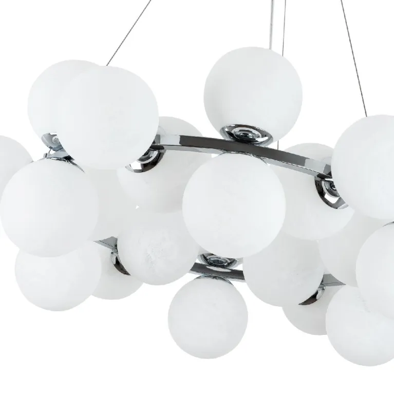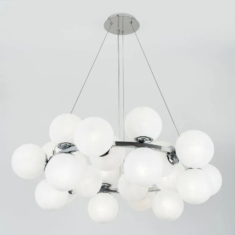 Преобладающий цвет плафонов: Белый, арматуры: Хром; материал изготовления арматуры: Металл, размеры, мм: / высота 1200 / диаметр 850. Общая мощность – 960 Ватт, а максимальная площадь освещения до 25 м2. Основной тип ламп, предусмотренный производителем: Накаливания с цоколем E14. В зависимости от предпочтений можно использовать лампы теплового, холодного или нейтрального света, за исключением люстр с типом цоколя LED.