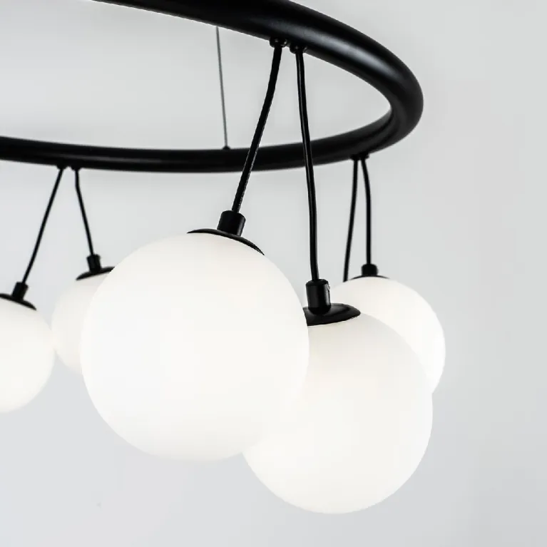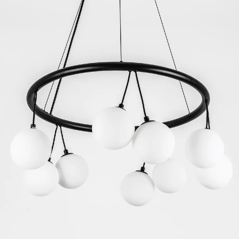 Преобладающий цвет плафонов: Белый, арматуры: Черный; материал изготовления арматуры: Металл, размеры, мм: / высота 1500 / диаметр 600. Общая мощность – Ватт, а максимальная площадь освещения до 17 м2. Основной тип ламп, предусмотренный производителем: с цоколем G9. В зависимости от предпочтений можно использовать лампы теплового, холодного или нейтрального света, за исключением люстр с типом цоколя LED.