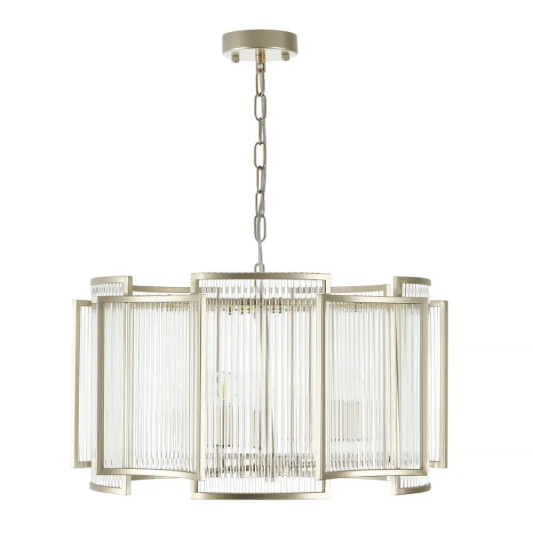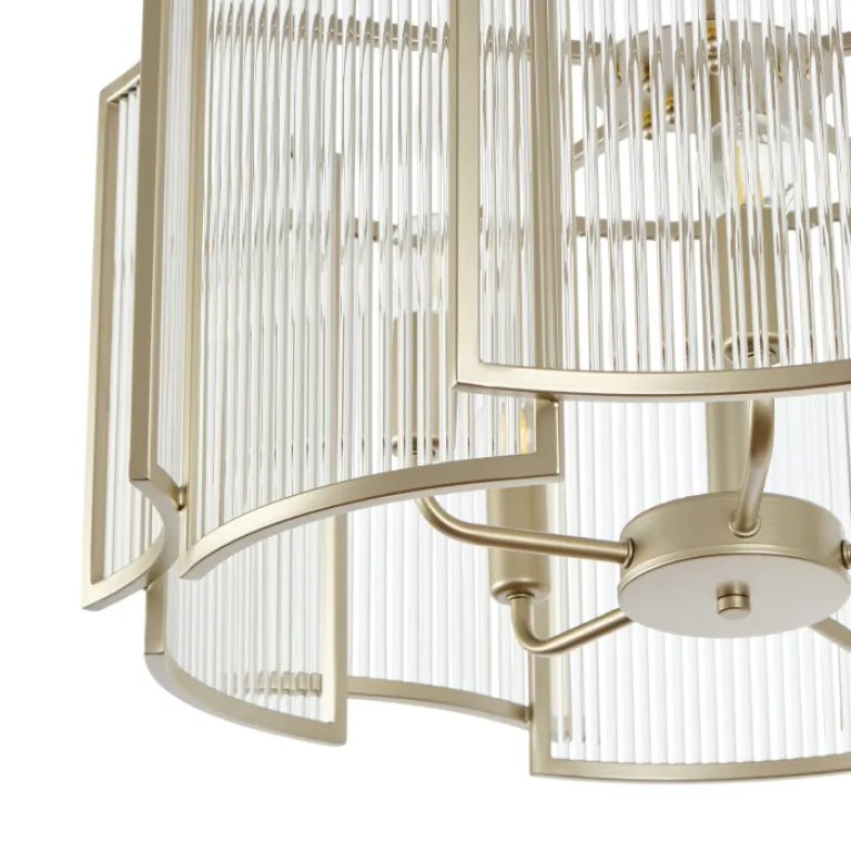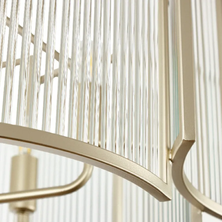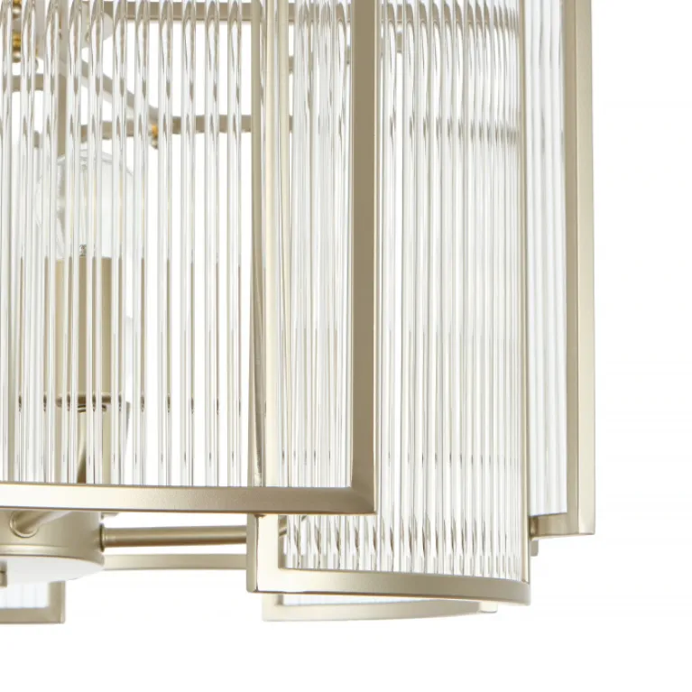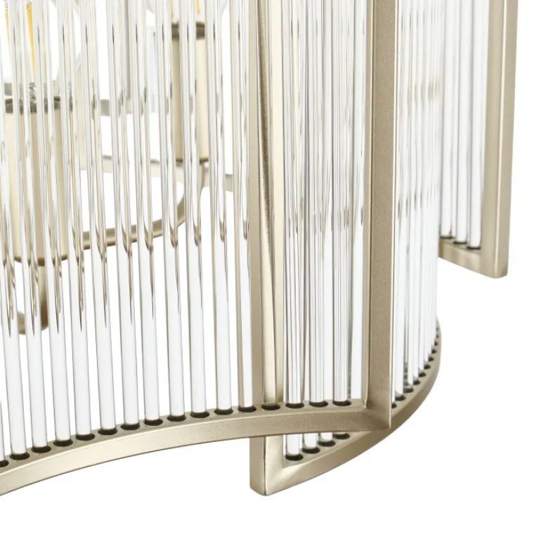 Преобладающий цвет плафонов: Прозрачный, арматуры: Шампань; материал изготовления арматуры: Металл, размеры, мм: / высота 720 / диаметр 560. Общая мощность – 300 Ватт, а максимальная площадь освещения до 15 м2. Основной тип ламп, предусмотренный производителем: Накаливания с цоколем E14. В зависимости от предпочтений можно использовать лампы теплового, холодного или нейтрального света, за исключением люстр с типом цоколя LED.