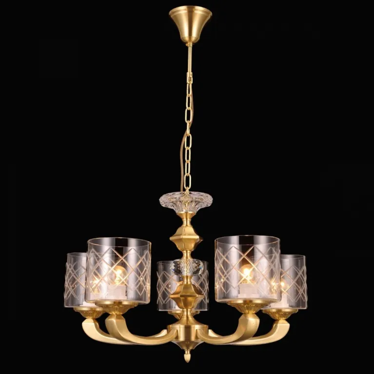 люстра оснащена пятью источниками света с цоколем E14, что позволяет использовать различные типы ламп, включая энергосберегающие и светодиодные. Такое количество ламп обеспечивает яркое и равномерное освещение пространства площадью до 30 квадратных метров, делая ваш дом светлым и просторным.