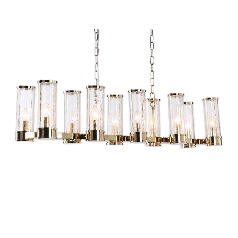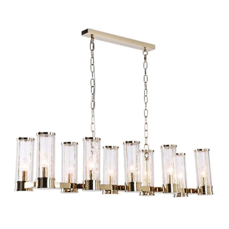 Преобладающий цвет люстры: Золотой, плафонов: Прозрачный, арматуры: Золотой; материал изготовления арматуры: Металл, размеры, мм: длина 1100 / ширина 290 / высота 250 Общая мощность – 600 Ватт. Основной тип ламп, предусмотренный производителем: Накаливания с цоколем E14. В зависимости от предпочтений можно использовать лампы теплового, холодного или нейтрального света, за исключением люстр с типом цоколя LED.