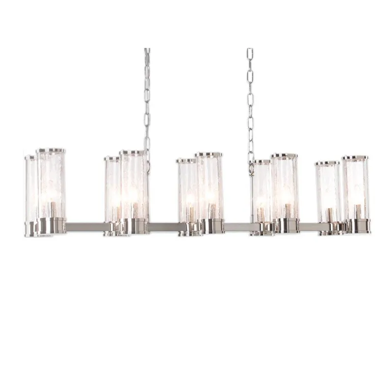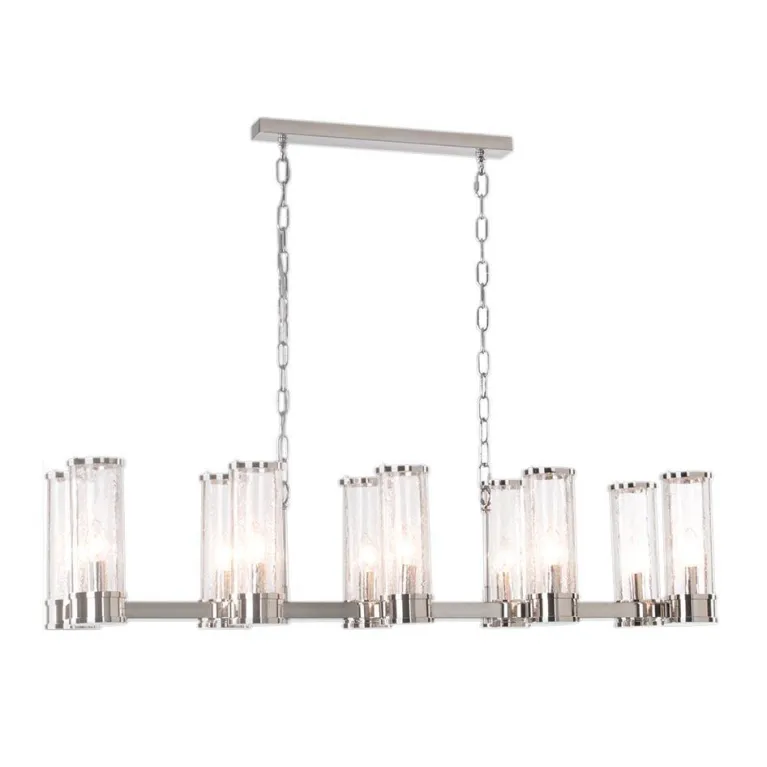 Преобладающий цвет люстры: Хром, плафонов: Прозрачный, арматуры: Хром; материал изготовления арматуры: Металл, размеры, мм: длина 1100 / ширина 290 / высота 250 Общая мощность – 600 Ватт. Основной тип ламп, предусмотренный производителем: Накаливания с цоколем E14. В зависимости от предпочтений можно использовать лампы теплового, холодного или нейтрального света, за исключением люстр с типом цоколя LED.