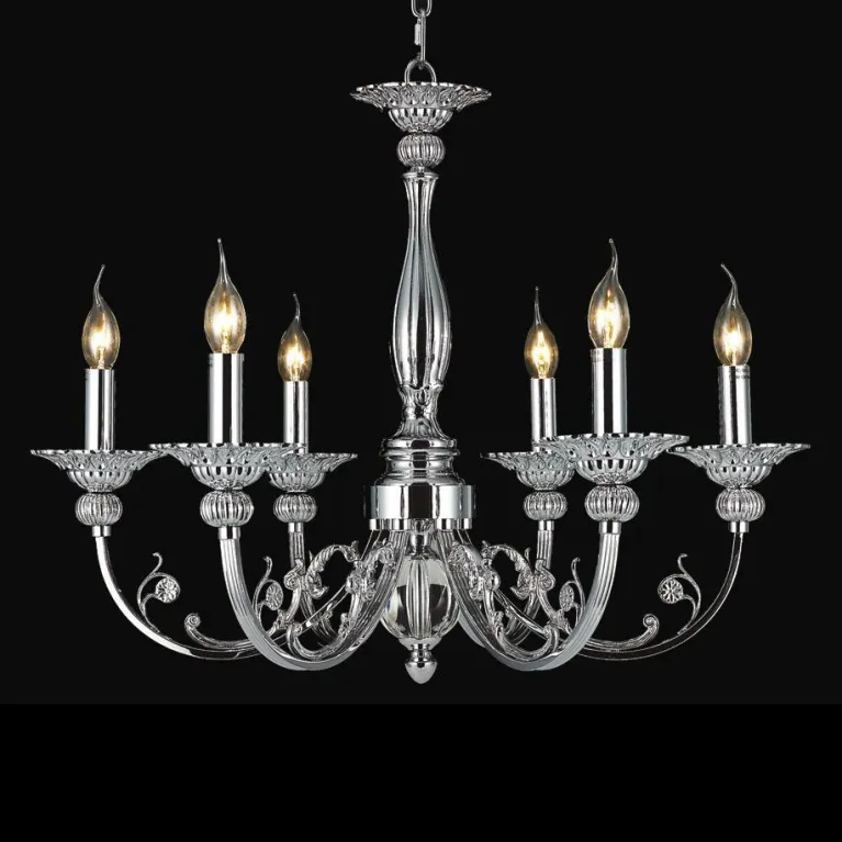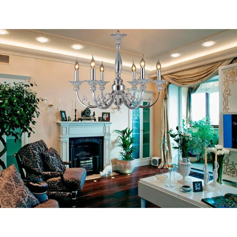 Преобладающий цвет люстры: Хром, арматуры: Хром; материал изготовления арматуры: Металл, размеры, мм: / высота 530 / диаметр 700. Общая мощность – 360 Ватт, а максимальная площадь освещения до 20 м2. Основной тип ламп, предусмотренный производителем: Накаливания с цоколем E14. В зависимости от предпочтений можно использовать лампы теплового, холодного или нейтрального света, за исключением люстр с типом цоколя LED.