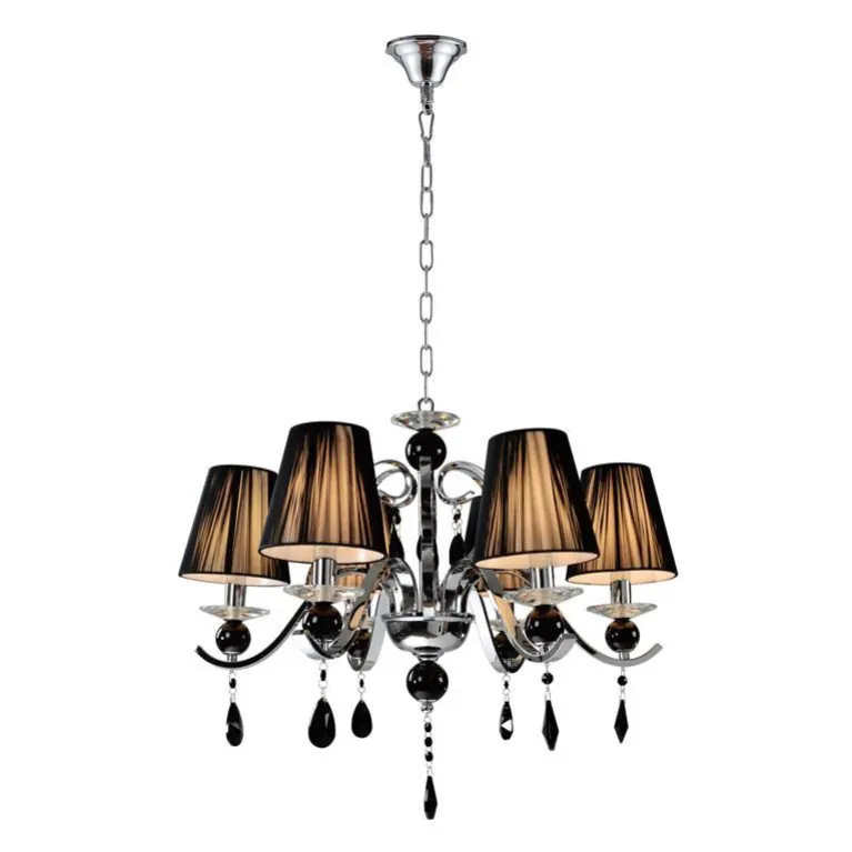 Преобладающий цвет люстры: Черный, плафонов: Черный, арматуры: Матовый никель; материал изготовления арматуры: Металл, размеры, мм: / высота 500 / диаметр 810. Общая мощность – 320 Ватт, а максимальная площадь освещения до 17,8 м2. Основной тип ламп, предусмотренный производителем: Накаливания с цоколем E14. В зависимости от предпочтений можно использовать лампы теплового, холодного или нейтрального света, за исключением люстр с типом цоколя LED.