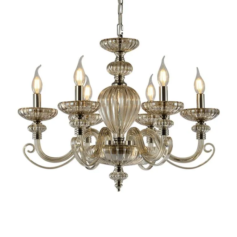Преобладающий цвет люстры: Коричневый, арматуры: Никель; материал изготовления арматуры: Металл, размеры, мм: / высота 490 / диаметр 640. Общая мощность – 240 Ватт. Основной тип ламп, предусмотренный производителем: Накаливания с цоколем E14. В зависимости от предпочтений можно использовать лампы теплового, холодного или нейтрального света, за исключением люстр с типом цоколя LED.