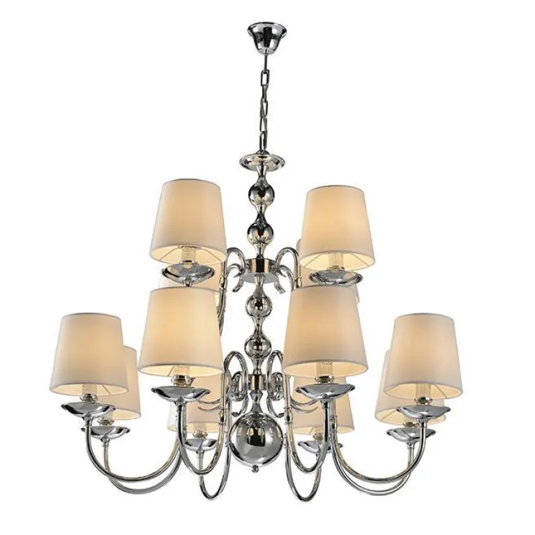 Преобладающий цвет люстры: Белый, плафонов: Белый, арматуры: Хром; материал изготовления арматуры: Металл, размеры, мм: / высота 750 / диаметр 900. Общая мощность – 720 Ватт. Основной тип ламп, предусмотренный производителем: Накаливания с цоколем E14. В зависимости от предпочтений можно использовать лампы теплового, холодного или нейтрального света, за исключением люстр с типом цоколя LED.