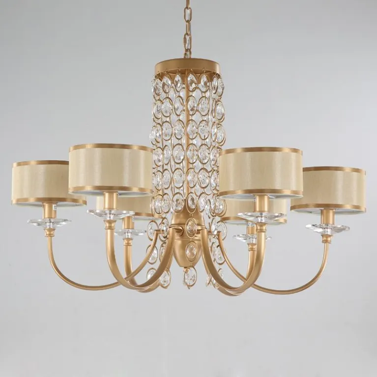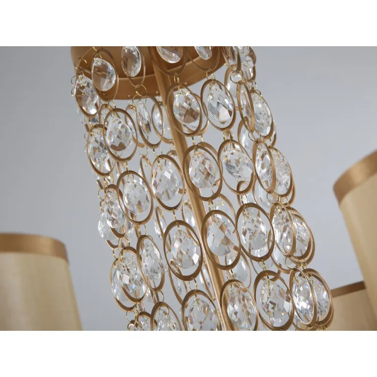 Преобладающий цвет люстры: Бежевый, плафонов: Бежевый, арматуры: Золото; материал изготовления арматуры: Металл, размеры, мм: / высота 550 / диаметр 780. Общая мощность – 360 Ватт, а максимальная площадь освещения до 20 м2. Основной тип ламп, предусмотренный производителем: Накаливания с цоколем E14. В зависимости от предпочтений можно использовать лампы теплового, холодного или нейтрального света, за исключением люстр с типом цоколя LED.