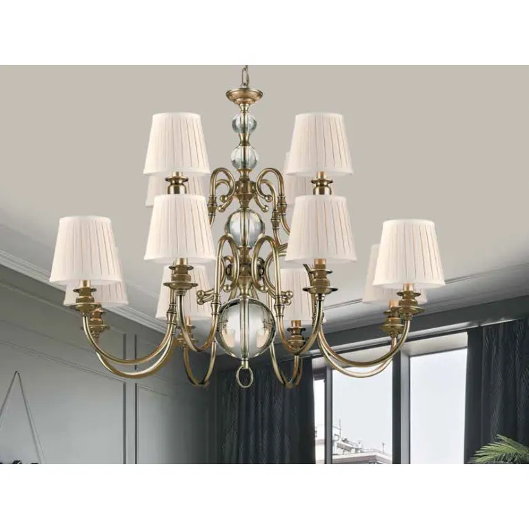 Преобладающий цвет арматуры: Латунь; материал изготовления арматуры: Металл, размеры, мм: / высота 730 / диаметр 900. Общая мощность – 720 Ватт, а максимальная площадь освещения до 36 м2. Основной тип ламп, предусмотренный производителем: Накаливания с цоколем E14. В зависимости от предпочтений можно использовать лампы теплового, холодного или нейтрального света, за исключением люстр с типом цоколя LED.