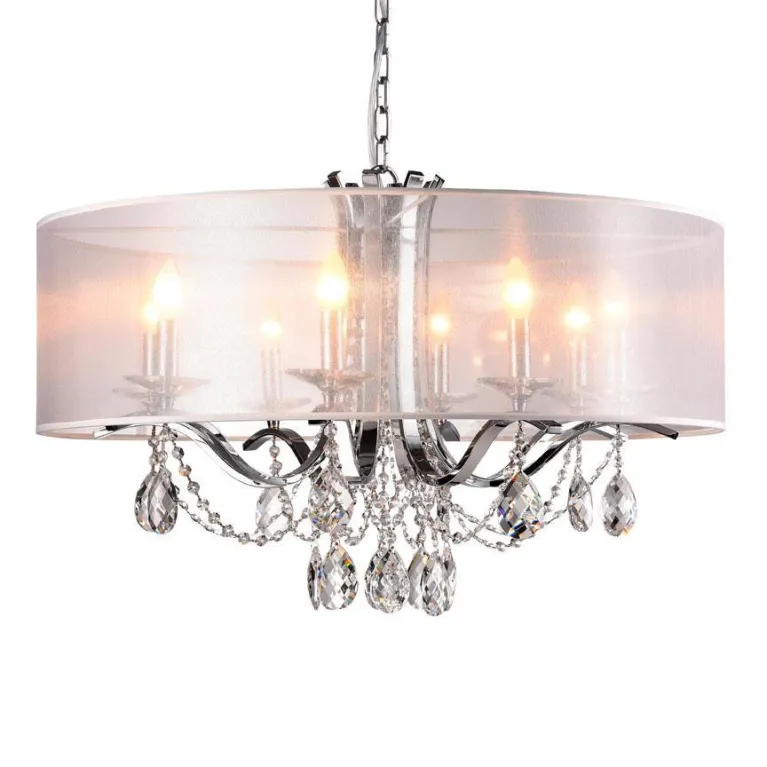 Преобладающий цвет люстры: Бежевый, плафонов: Бежевый, арматуры: Хром; материал изготовления арматуры: Металл, размеры, мм: / высота 520 / диаметр 800. Общая мощность – 480 Ватт, а максимальная площадь освещения до 26,7 м2. Основной тип ламп, предусмотренный производителем: Накаливания с цоколем E14. В зависимости от предпочтений можно использовать лампы теплового, холодного или нейтрального света, за исключением люстр с типом цоколя LED.