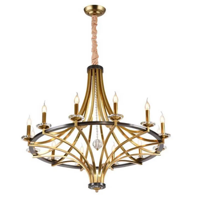 Преобладающий цвет люстры: Латунь, арматуры: Латунь; материал изготовления арматуры: Металл, размеры, мм: / высота 1000 / диаметр 1030. Общая мощность – 720 Ватт. Основной тип ламп, предусмотренный производителем: Накаливания с цоколем E14. В зависимости от предпочтений можно использовать лампы теплового, холодного или нейтрального света, за исключением люстр с типом цоколя LED.