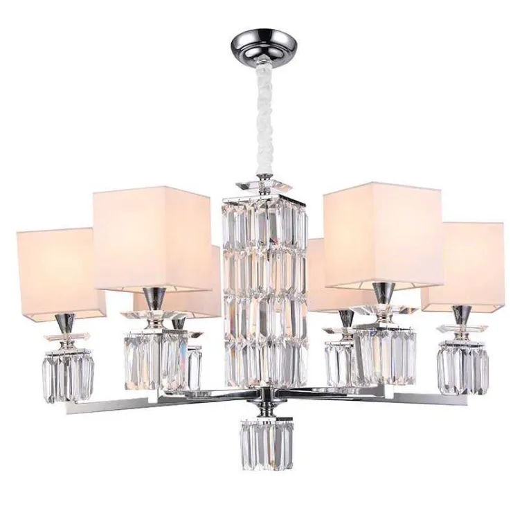 Преобладающий цвет люстры: Белый, плафонов: Белый, арматуры: Хром; материал изготовления арматуры: Металл, размеры, мм: / высота 650 / диаметр 900. Общая мощность – 360 Ватт, а максимальная площадь освещения до 20 м2. Основной тип ламп, предусмотренный производителем: Накаливания с цоколем E14. В зависимости от предпочтений можно использовать лампы теплового, холодного или нейтрального света, за исключением люстр с типом цоколя LED.
