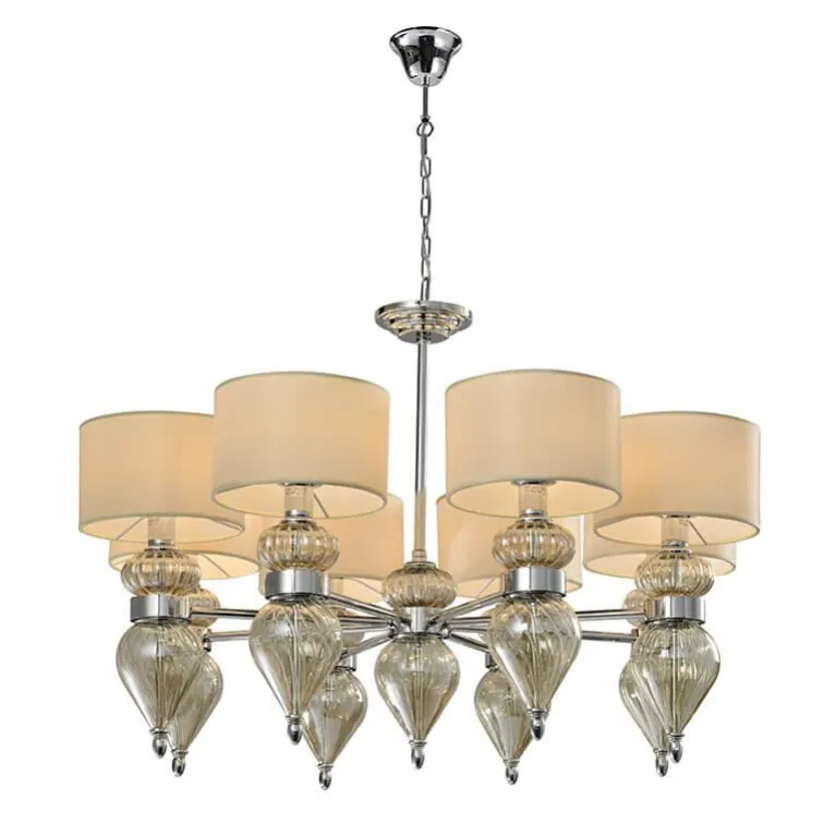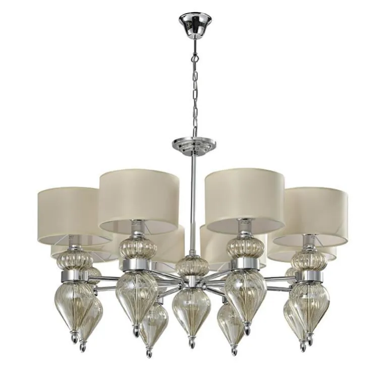 Преобладающий цвет люстры: Бежевый, плафонов: Бежевый, арматуры: Матовый никель; материал изготовления арматуры: Металл, размеры, мм: / высота 500 / диаметр 820. Общая мощность – 320 Ватт. Основной тип ламп, предусмотренный производителем: Накаливания с цоколем E14. В зависимости от предпочтений можно использовать лампы теплового, холодного или нейтрального света, за исключением люстр с типом цоколя LED.