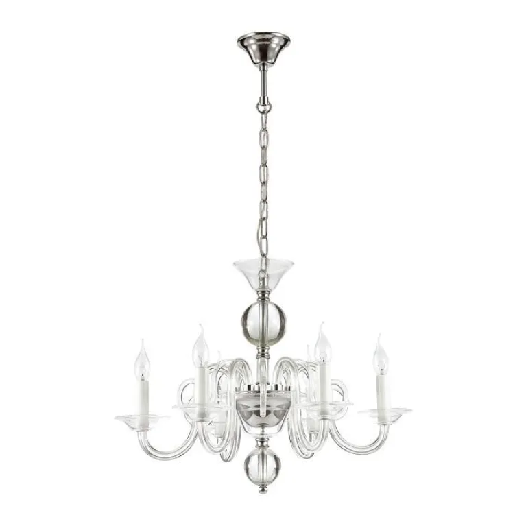 Преобладающий цвет люстры: Хром, арматуры: Хром; материал изготовления арматуры: Металл, размеры, мм: / высота 500 / диаметр 640. Общая мощность – 240 Ватт, а максимальная площадь освещения до 13,3 м2. Основной тип ламп, предусмотренный производителем: Накаливания с цоколем E14. В зависимости от предпочтений можно использовать лампы теплового, холодного или нейтрального света, за исключением люстр с типом цоколя LED.