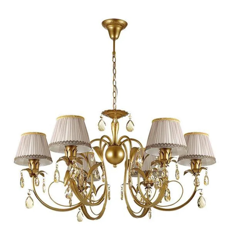 Преобладающий цвет люстры: Белый, плафонов: Белый, арматуры: Золото; материал изготовления арматуры: Металл, размеры, мм: / высота 417 / диаметр 777. Общая мощность – 240 Ватт, а максимальная площадь освещения до 13,3 м2. Основной тип ламп, предусмотренный производителем: Накаливания с цоколем E14. В зависимости от предпочтений можно использовать лампы теплового, холодного или нейтрального света, за исключением люстр с типом цоколя LED.