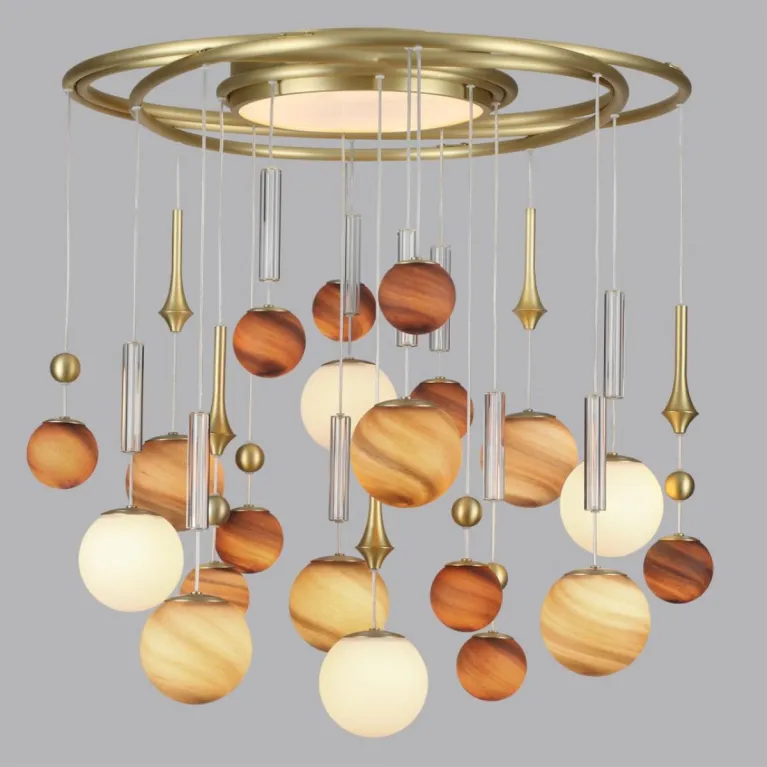 Преобладающий цвет плафонов: Разноцветный, арматуры: Латунь; материал изготовления арматуры: Металл, размеры, мм: / высота 790 / диаметр 790. Общая мощность – 120 Ватт. Основной тип ламп, предусмотренный производителем: Светодиодная с цоколем G9. В зависимости от предпочтений можно использовать лампы теплового, холодного или нейтрального света, за исключением люстр с типом цоколя LED.