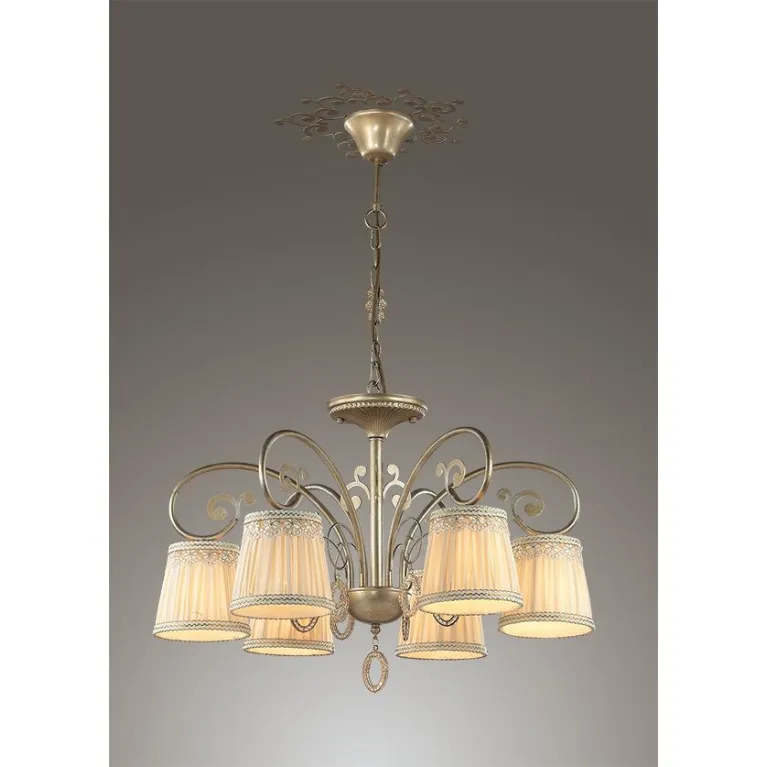 Преобладающий цвет люстры: Бежевый, плафонов: Бежевый, арматуры: Золото; материал изготовления арматуры: Металл, размеры, мм: / высота 410 / диаметр 620. Общая мощность – 240 Ватт, а максимальная площадь освещения до 13,3 м2. Основной тип ламп, предусмотренный производителем: Накаливания с цоколем E14. В зависимости от предпочтений можно использовать лампы теплового, холодного или нейтрального света, за исключением люстр с типом цоколя LED.