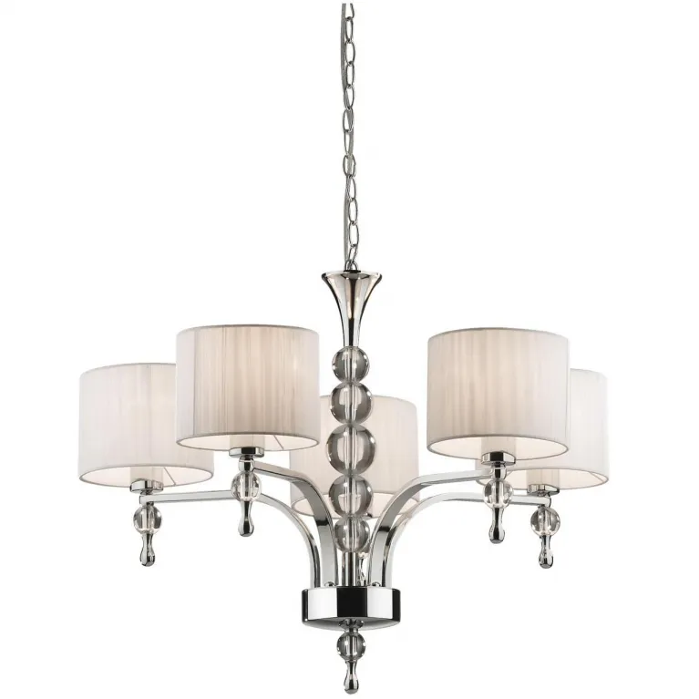 Преобладающий цвет люстры: Белый, плафонов: Белый, арматуры: Хром; материал изготовления арматуры: Металл, размеры, мм: / высота 590 / диаметр 740. Общая мощность – 300 Ватт, а максимальная площадь освещения до 16,7 м2. Основной тип ламп, предусмотренный производителем: Накаливания с цоколем E27. В зависимости от предпочтений можно использовать лампы теплового, холодного или нейтрального света, за исключением люстр с типом цоколя LED.