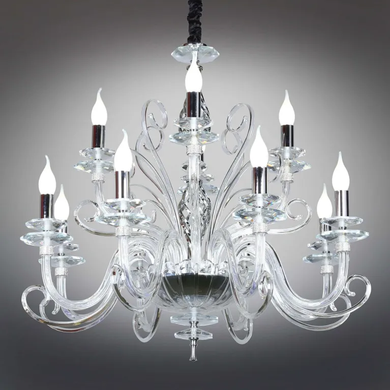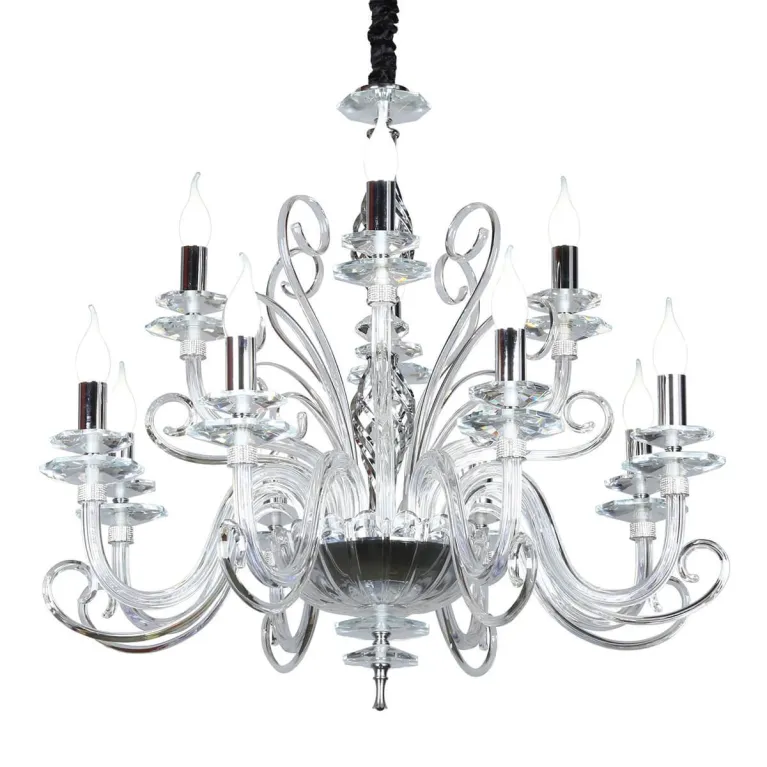 Преобладающий цвет люстры: Хром, арматуры: Хром; материал изготовления арматуры: Металл, размеры, мм: / высота 920 / диаметр 760. Общая мощность – 480 Ватт, а максимальная площадь освещения до 26,7 м2. Основной тип ламп, предусмотренный производителем: Накаливания с цоколем E14. В зависимости от предпочтений можно использовать лампы теплового, холодного или нейтрального света, за исключением люстр с типом цоколя LED.