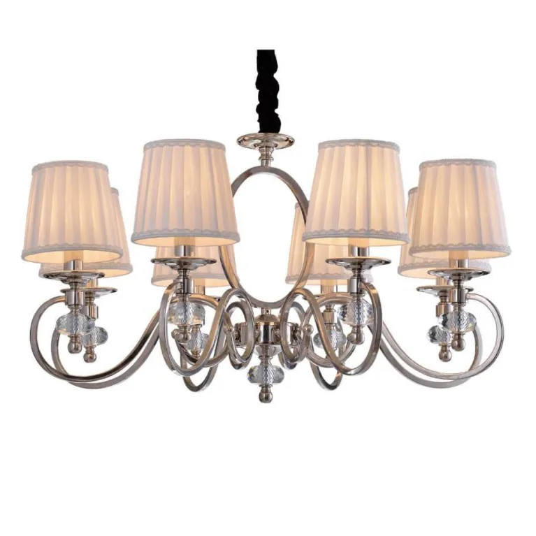 Преобладающий цвет люстры: Белый, плафонов: Белый, арматуры: Хром; материал изготовления арматуры: Металл, размеры, мм: / высота 460 / диаметр 770. Общая мощность – 320 Ватт, а максимальная площадь освещения до 16 м2. Основной тип ламп, предусмотренный производителем: Накаливания с цоколем E14. В зависимости от предпочтений можно использовать лампы теплового, холодного или нейтрального света, за исключением люстр с типом цоколя LED.