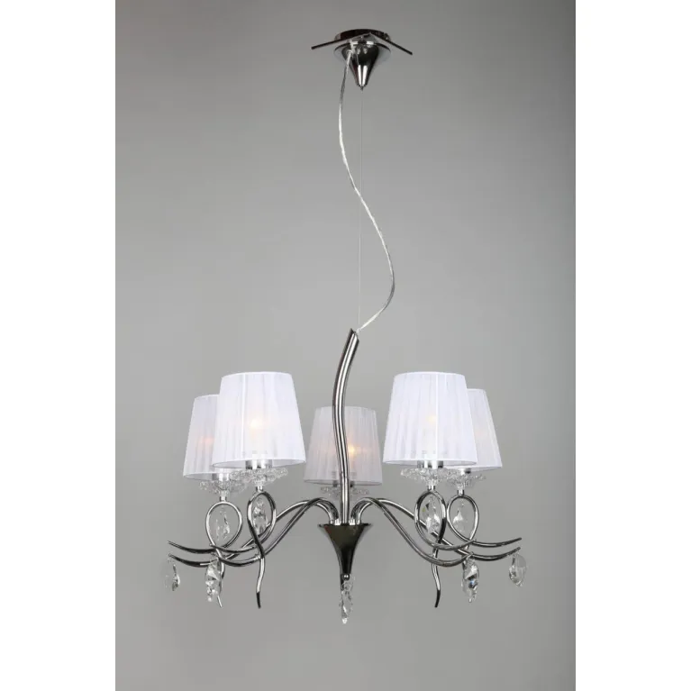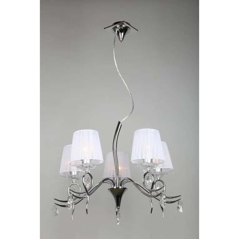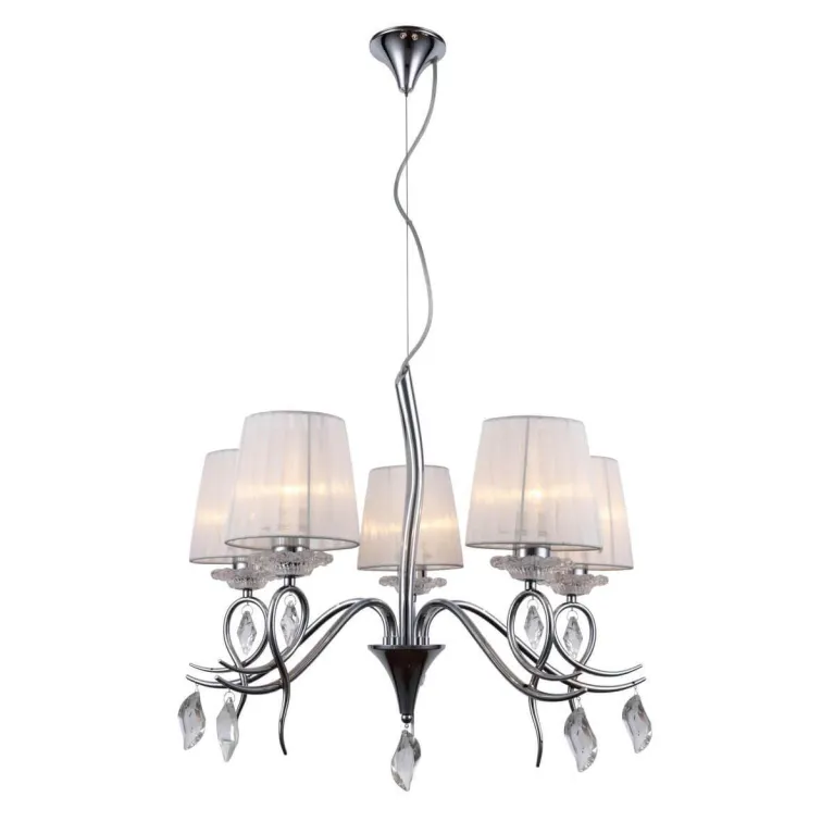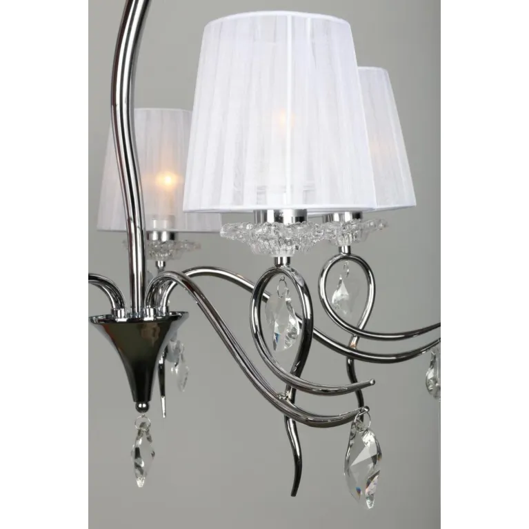 Преобладающий цвет люстры: Белый, плафонов: Белый, арматуры: Хром; материал изготовления арматуры: Металл, размеры, мм: / высота 740 / диаметр 710. Общая мощность – 200 Ватт, а максимальная площадь освещения до 11,1 м2. Основной тип ламп, предусмотренный производителем: Накаливания с цоколем E27. В зависимости от предпочтений можно использовать лампы теплового, холодного или нейтрального света, за исключением люстр с типом цоколя LED.