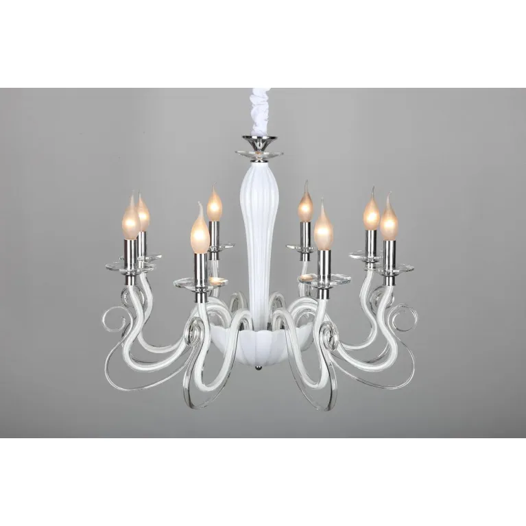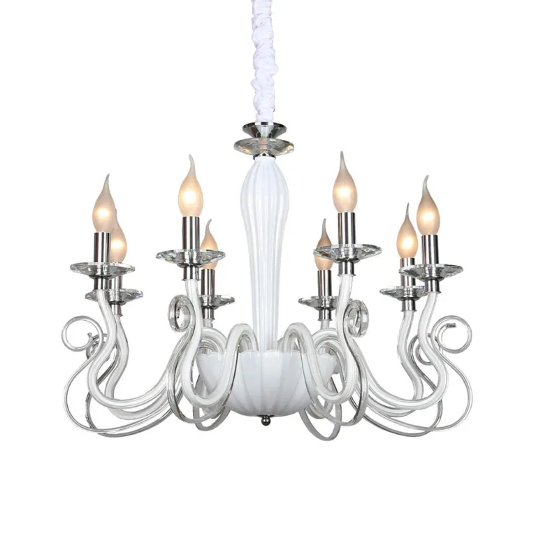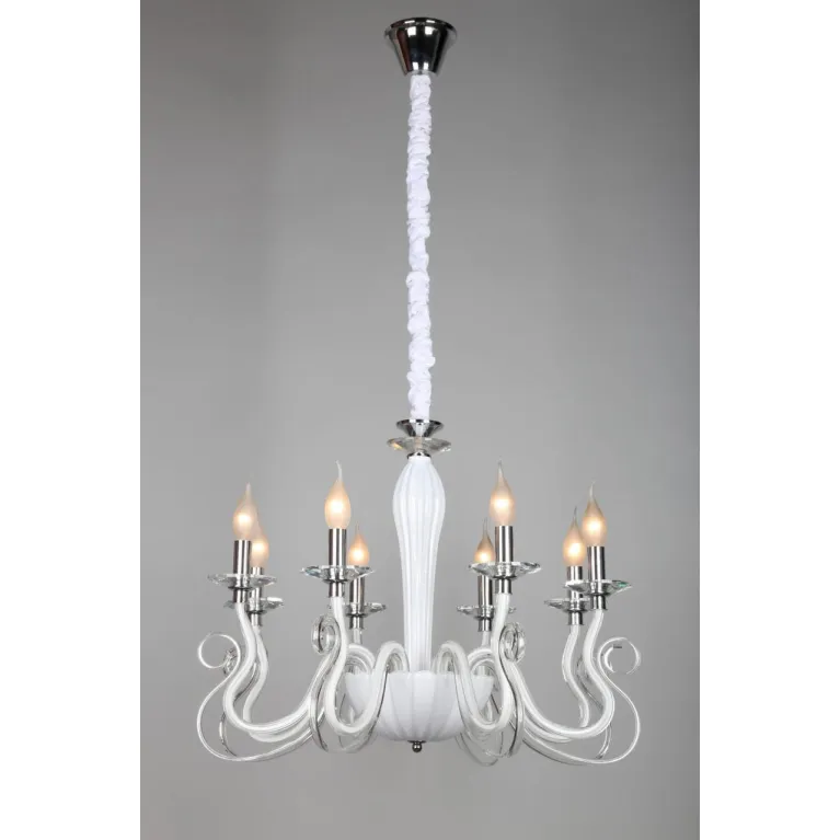 Преобладающий цвет люстры: Белый, арматуры: Хром; материал изготовления арматуры: Металл, размеры, мм: / высота 800 / диаметр 660. Общая мощность – 320 Ватт, а максимальная площадь освещения до 17,8 м2. Основной тип ламп, предусмотренный производителем: Накаливания с цоколем E14. В зависимости от предпочтений можно использовать лампы теплового, холодного или нейтрального света, за исключением люстр с типом цоколя LED.