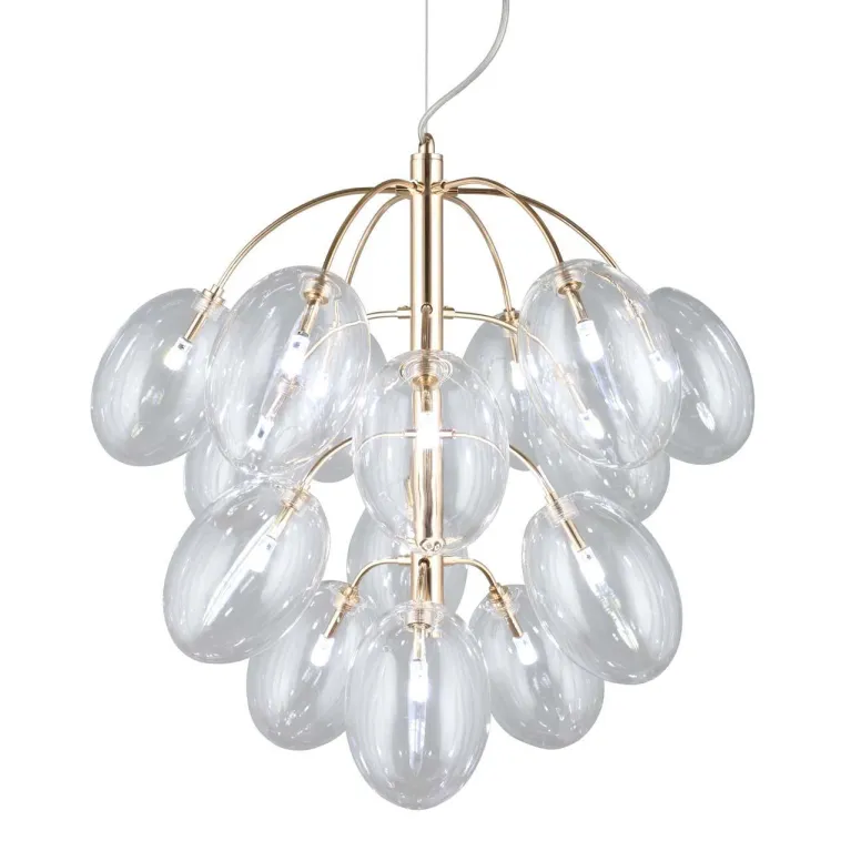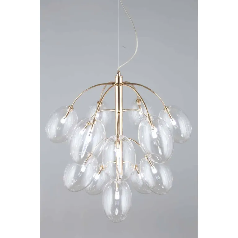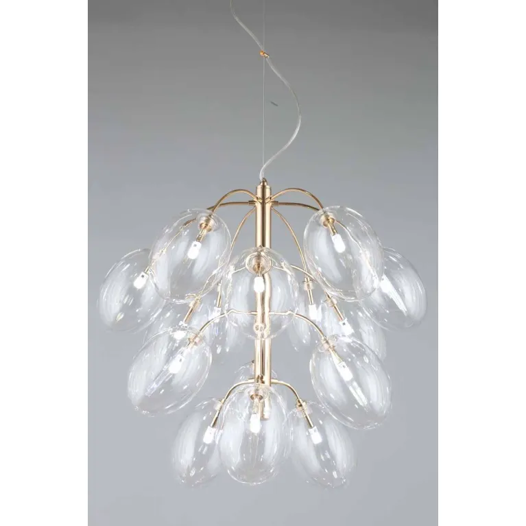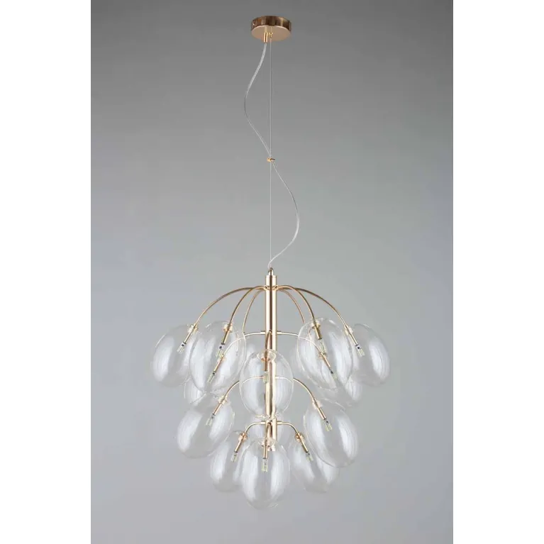 Преобладающий цвет люстры: Золото, плафонов: Прозрачный, арматуры: Золото; материал изготовления арматуры: Металл, размеры, мм: / высота 1600 / диаметр 580. Общая мощность – 480 Ватт. Основной тип ламп, предусмотренный производителем: Галогеновая с цоколем G9. В зависимости от предпочтений можно использовать лампы теплового, холодного или нейтрального света, за исключением люстр с типом цоколя LED.