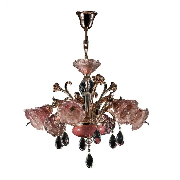Преобладающий цвет люстры: Розовый, плафонов: Розовый, арматуры: Золото; материал изготовления арматуры: Металл, размеры, мм: / высота 800 / диаметр 700. Общая мощность – 360 Ватт, а максимальная площадь освещения до 20 м2. Основной тип ламп, предусмотренный производителем: Накаливания с цоколем E14. В зависимости от предпочтений можно использовать лампы теплового, холодного или нейтрального света, за исключением люстр с типом цоколя LED.